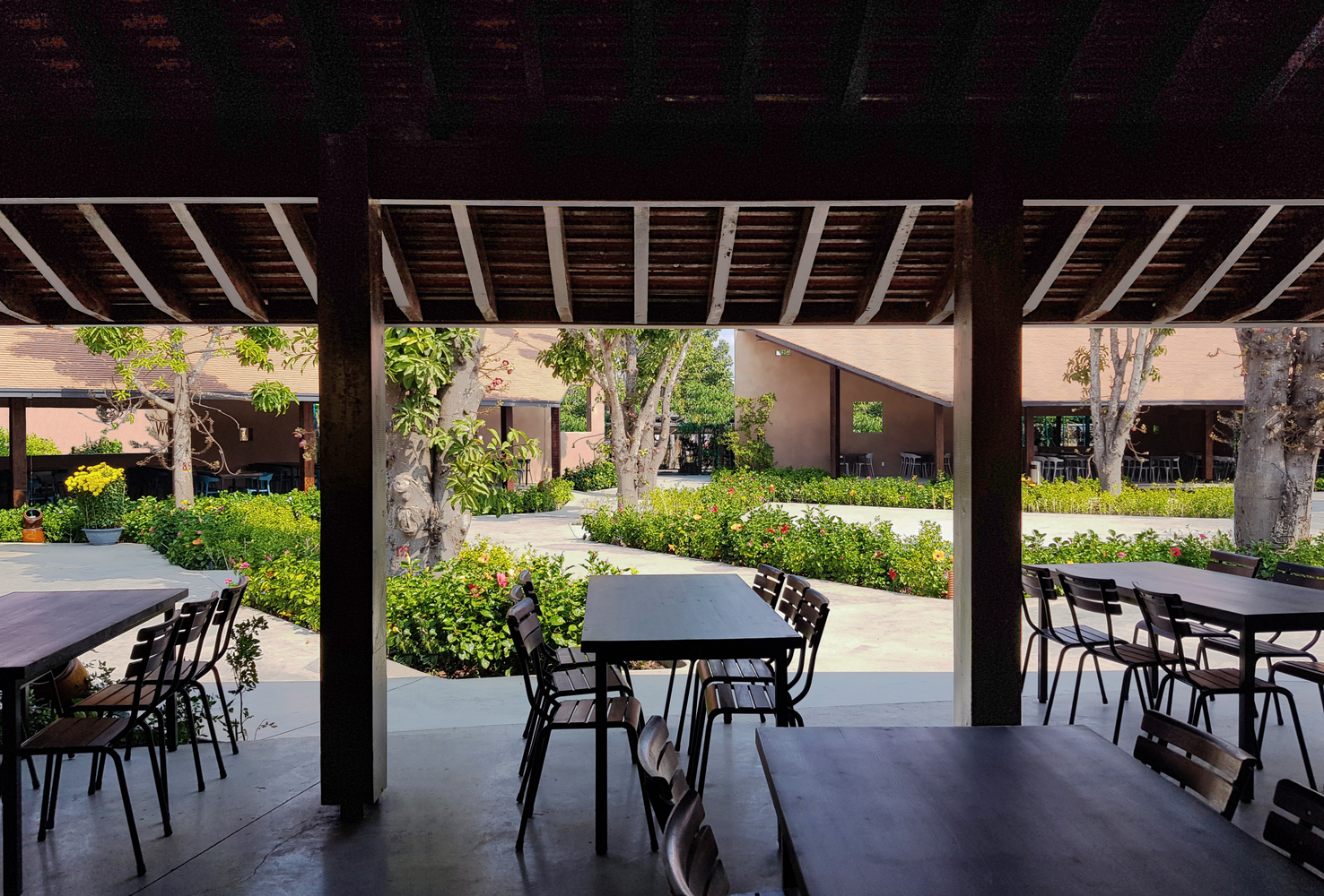 Bố cục là các khối nhà với các chức năng khác nhau và cấu trúc của các khối là một khoảng sân bao quanh. Sự sắp xếp các khối theo các hướng khác nhau đã tạo ra những góc nhìn thú vị. Cách bố trí này tạo nên sự kết hợp của các kết cấu đặc trưng: mái ngói dốc, cột, nửa trống, nửa kín là những kết cấu quen thuộc của kiến trúc truyền thống Việt Nam với phương pháp thi công đơn giản, tiết kiệm chi phí.