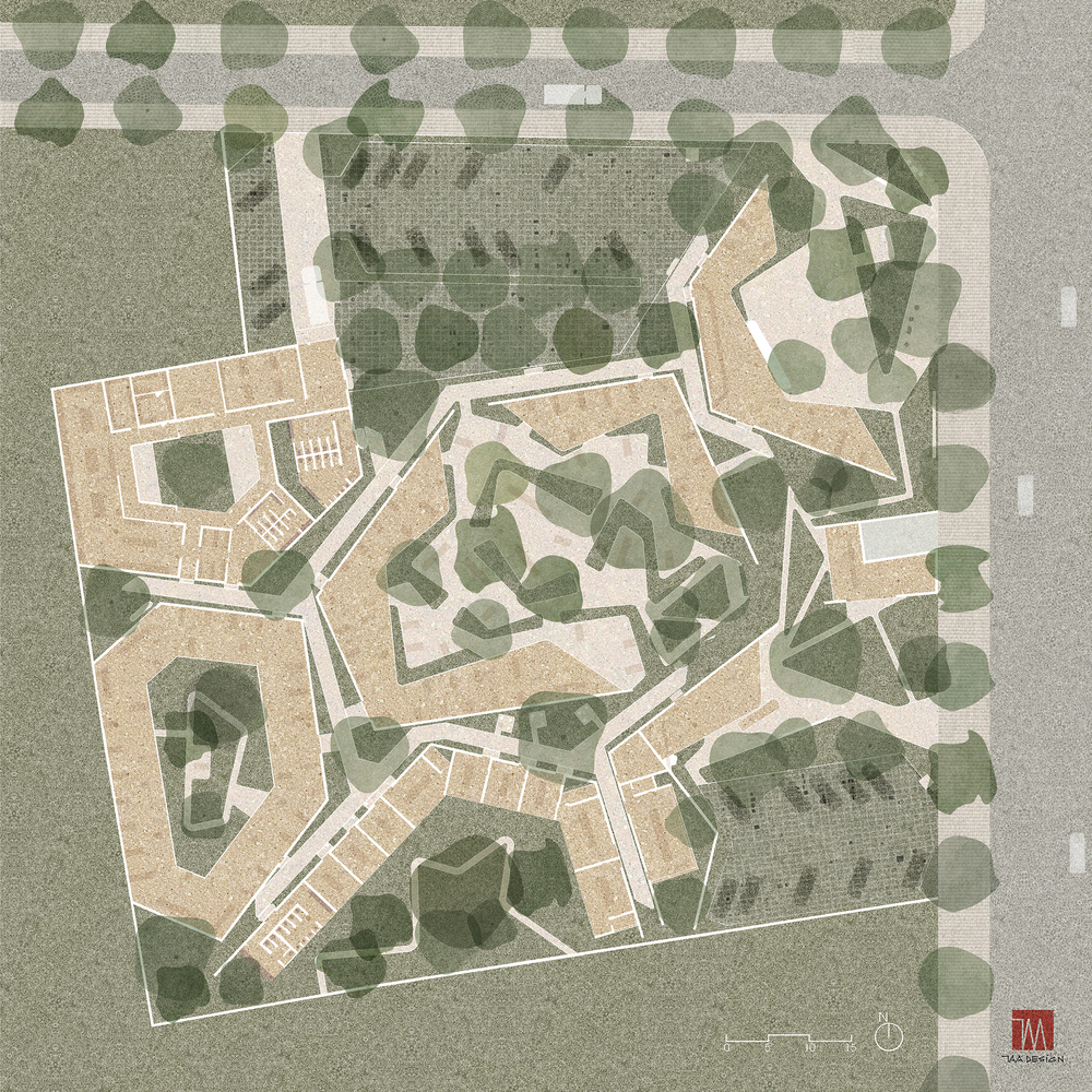 Thay vì sử dụng kết cấu thép công nghiệp và mô đun, nhóm thiết kế tiếp cận kiến trúc bằng sự thủ công, thô mộc và cảm xúc. Ý tưởng về một ngôi làng với những mái nhà đã tạo nên hình ảnh gợi nhớ nét quen thuộc của văn hóa truyền thống nhưng vẫn mang nét sáng tạo đương đại và thú vị.