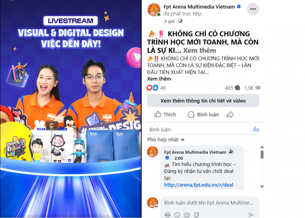 Song song với sự kiện trực tiếp tại Hà Nội, FPT Arena Multimedia tổ chức livestream ra mắt ngành học mới: Visual & Digital Design – Thiết kế thị giác & đồ họa số. Đây là hoạt động livestream đặc biệt dành cho những bạn trẻ không thể tham dự trực tiếp, nhưng vẫn mong muốn tìm hiểu ngành học, tương tác cùng chuyên gia và có cơ hội nhận ưu đãi giá trị.