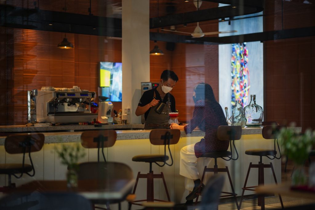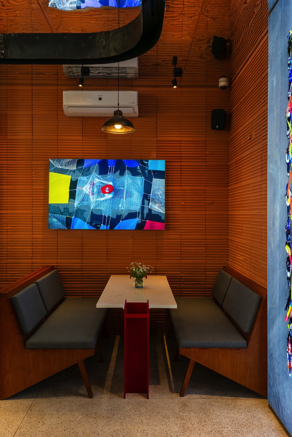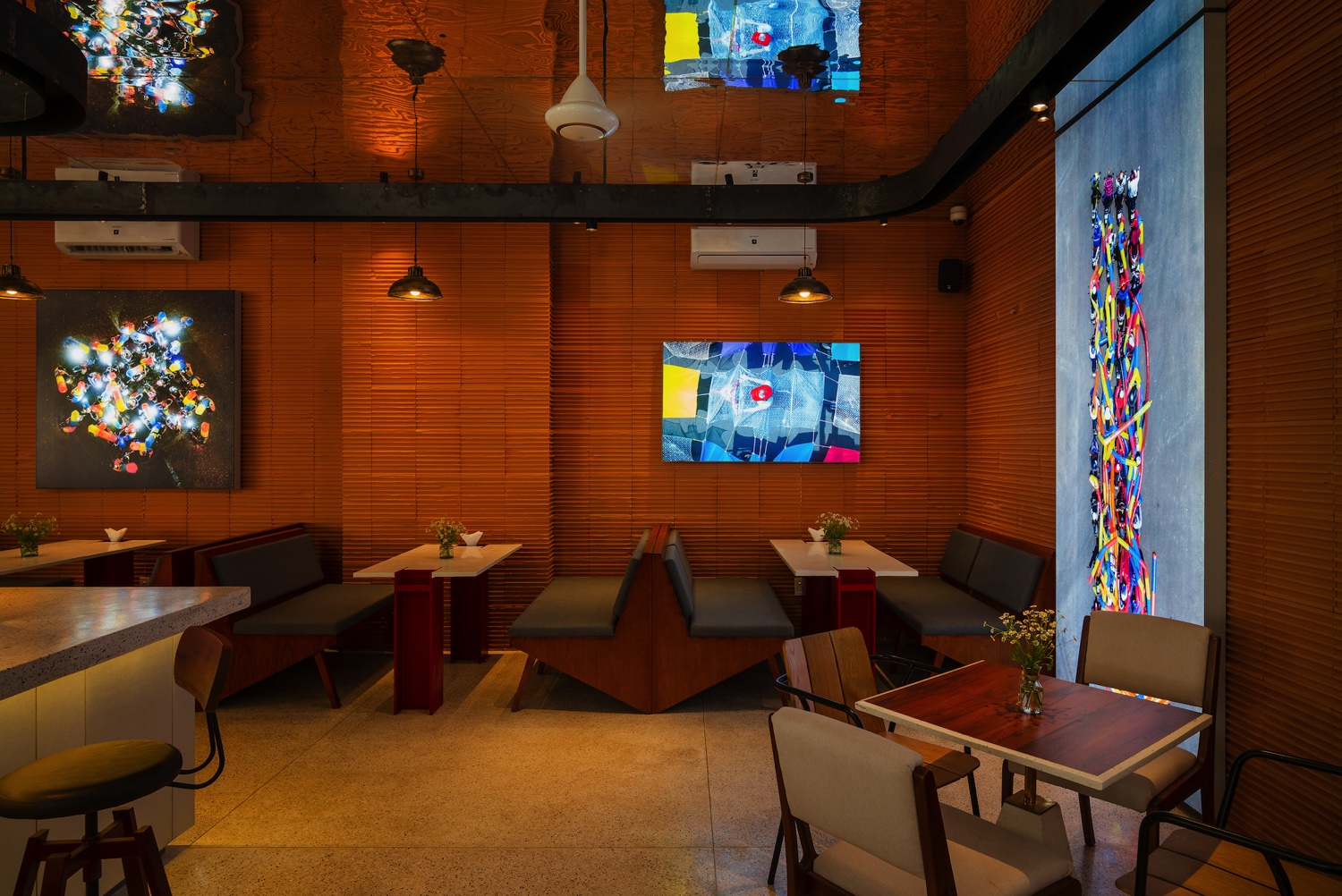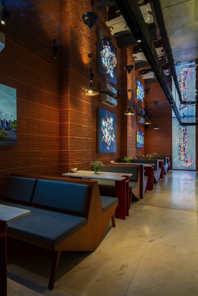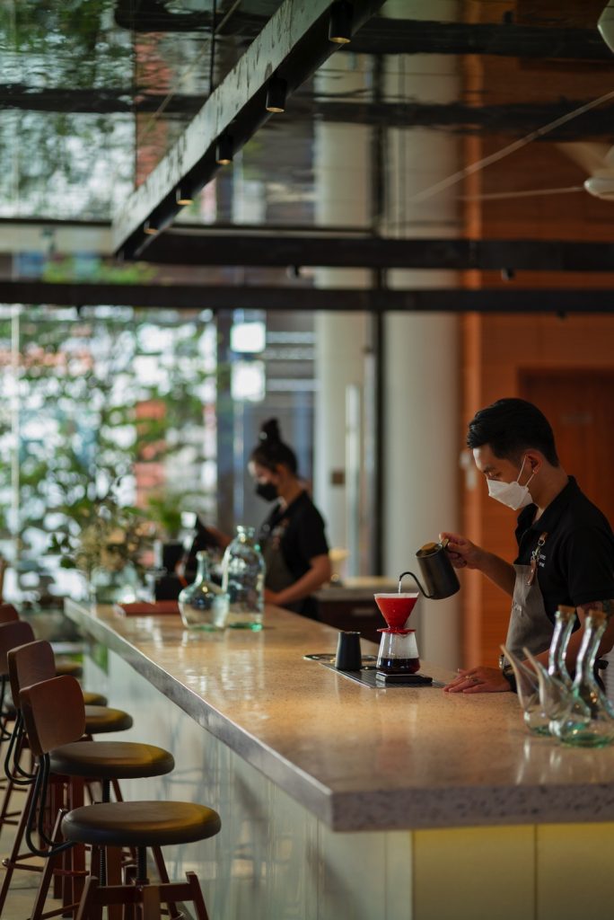 Không gian nội thất quán Piece Of Drink đề cao tính trải nghiệm dịch vụ, với quầy barista được đặt ở vị trí trung tâm giúp nhân viên có thể quan sát và phục vụ khách kịp thời. Có một sự chú ý tỉ mỉ đến từng chi tiết – từ độ êm của nệm ghế, hoa cắm trên bàn, mùi hương của quán, âm lượng của nhạc dạo… những bức tường trong không gian được ốp bằng gạch tàu với phần vân gạch hướng ra ngoài, nhằm hấp thụ tiếng ồn, để nơi đây thực sự là một chốn bình yên.