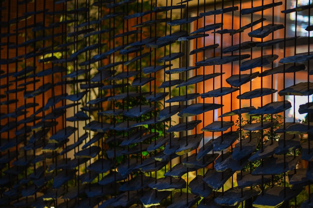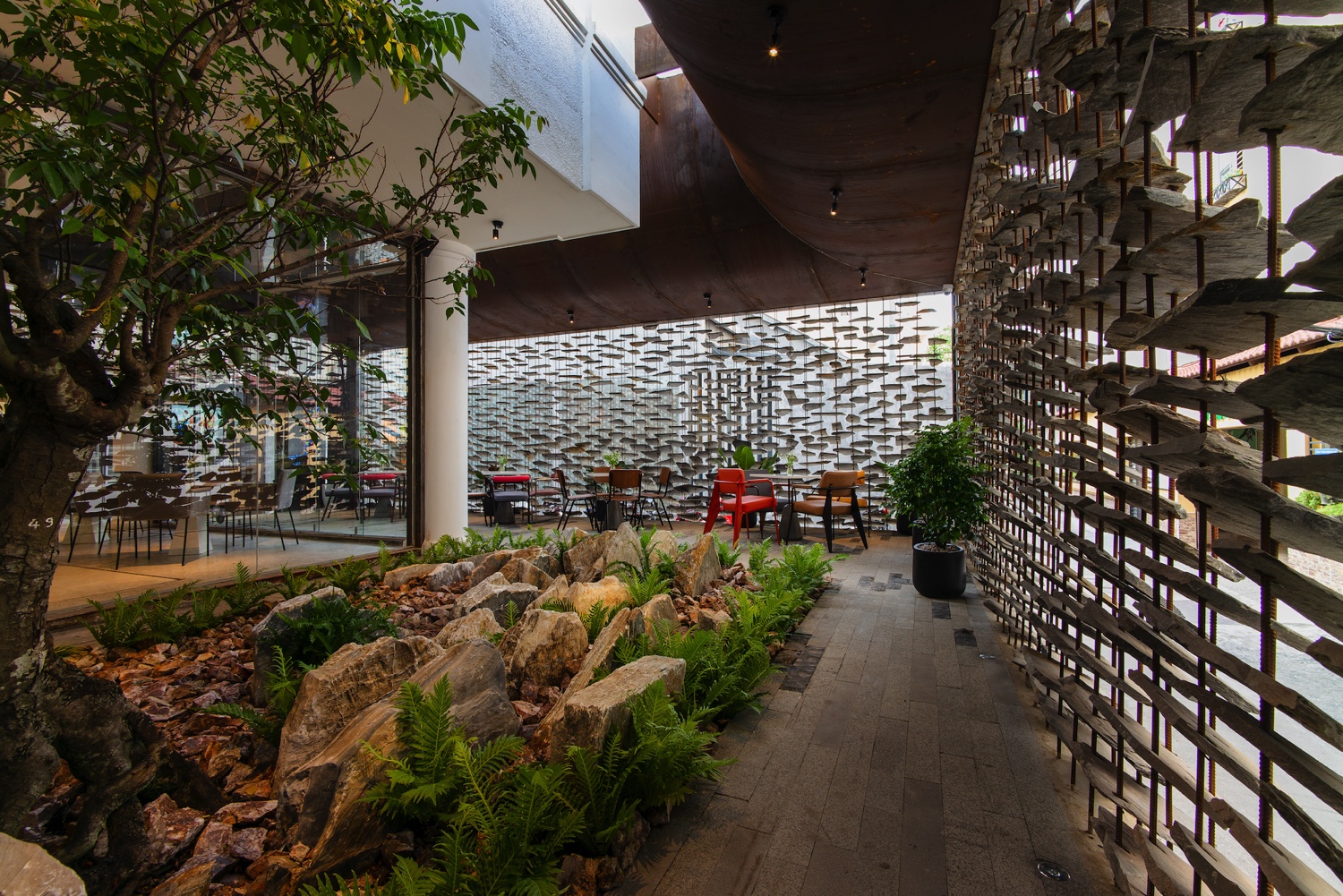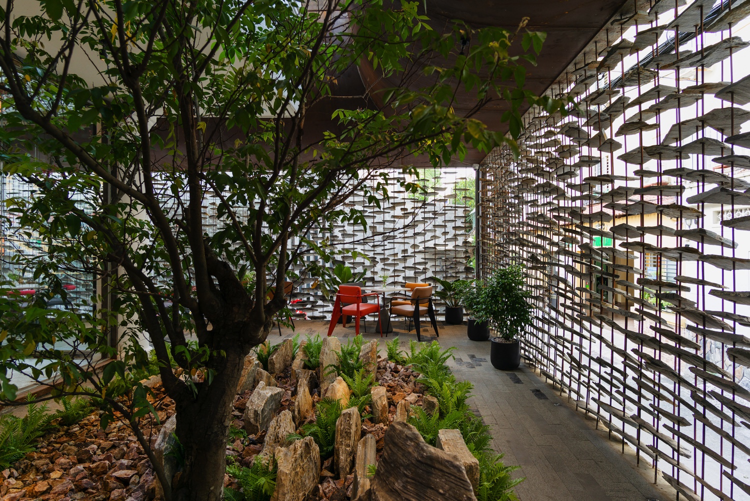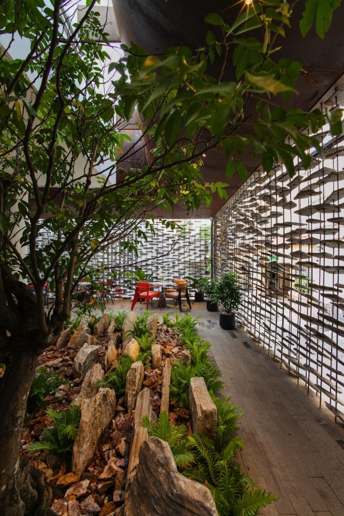 Tọa lạc trong con hẻm số 10 Nguyễn Thị Minh Khai, quán cà phê gây ấn tượng với người nhìn bằng một hàng rào đá độc đáo bao phủ không gian quán. Hàng rào được tạo nên bằng cách xếp những tầng đá lên với nhau thành một ‘hệ lá sách’ giúp chắn bớt ánh mặt trời gay gắt từ hướng Tây chiếu tới, đồng thời giúp giảm nhiệt, lưu thông khí cho công trình. Bức rào đá cũng rất hữu dụng trong việc cách âm, để giữa thành phố huyên náo xôn xao biết bao tiếng động, Piece Of Drink trở thành một ốc đảo yên bình gọi mời khách ghé chân.