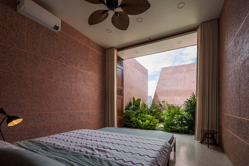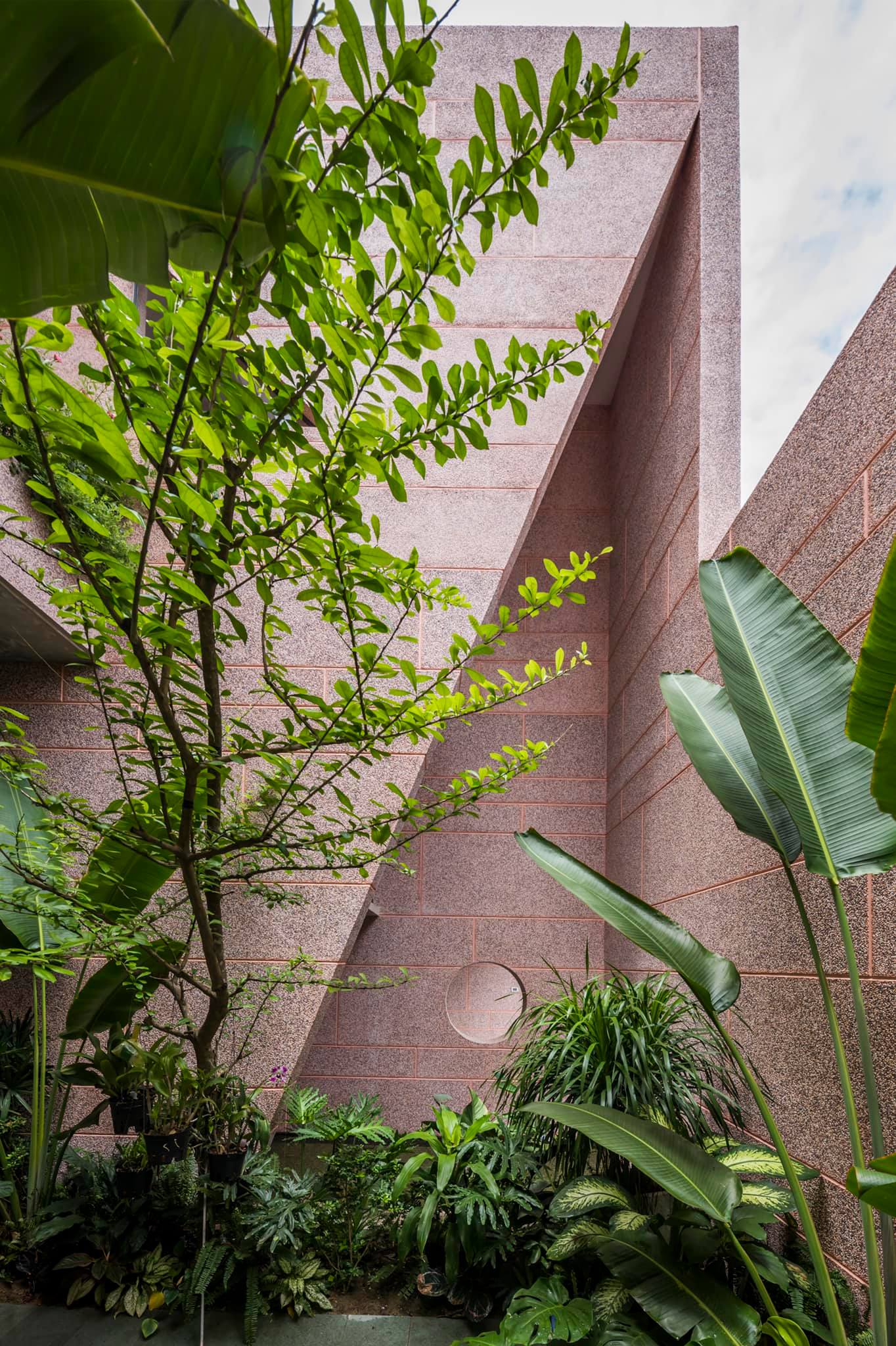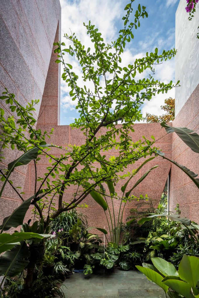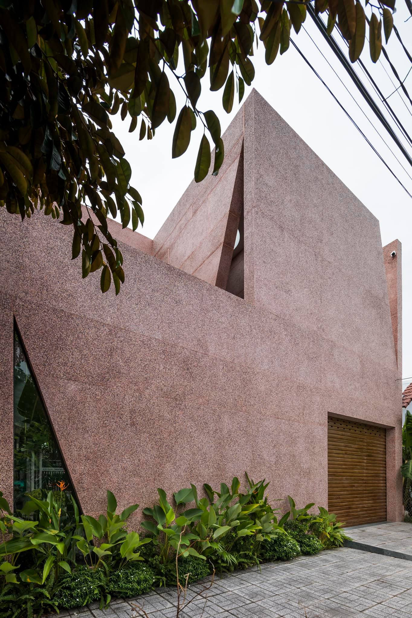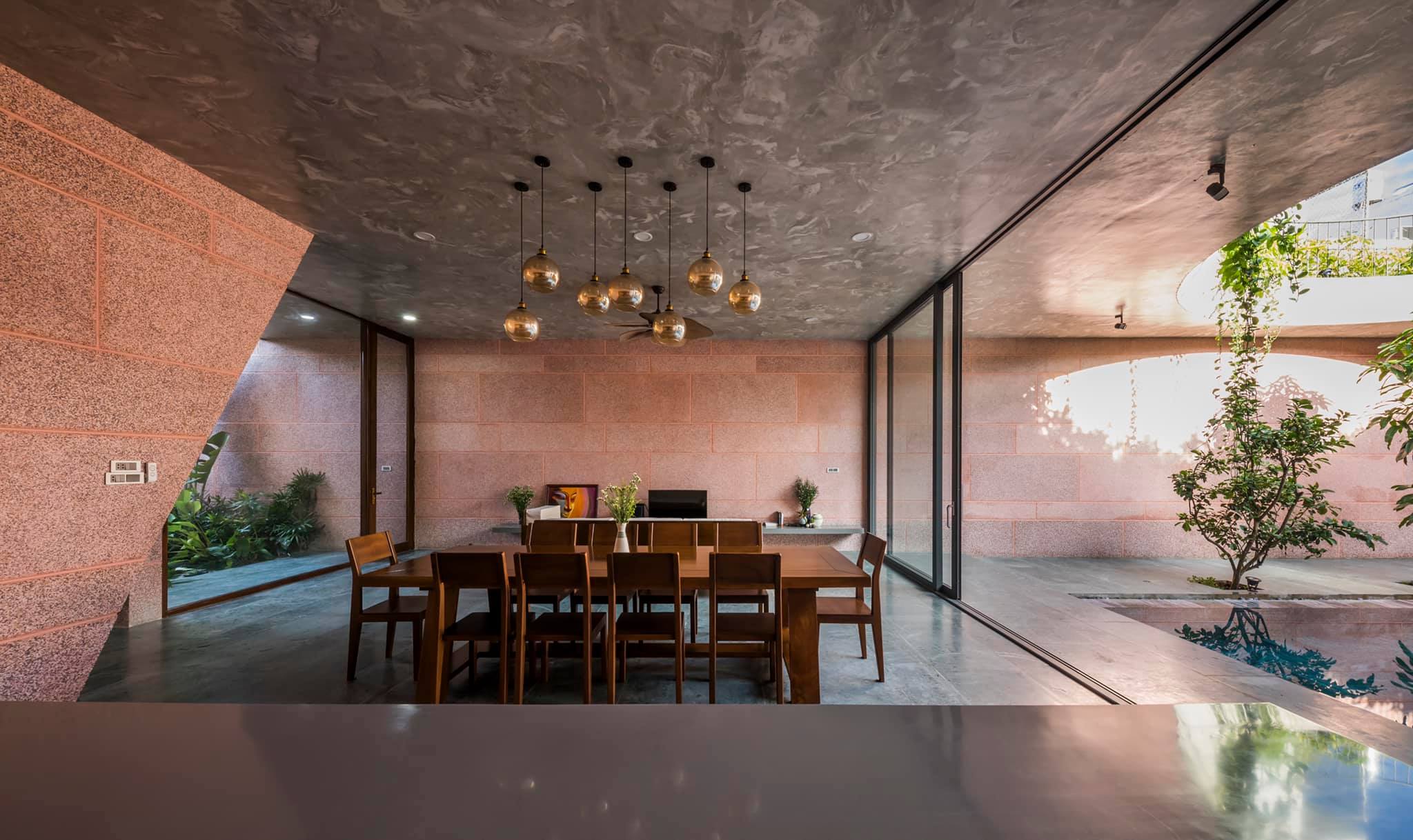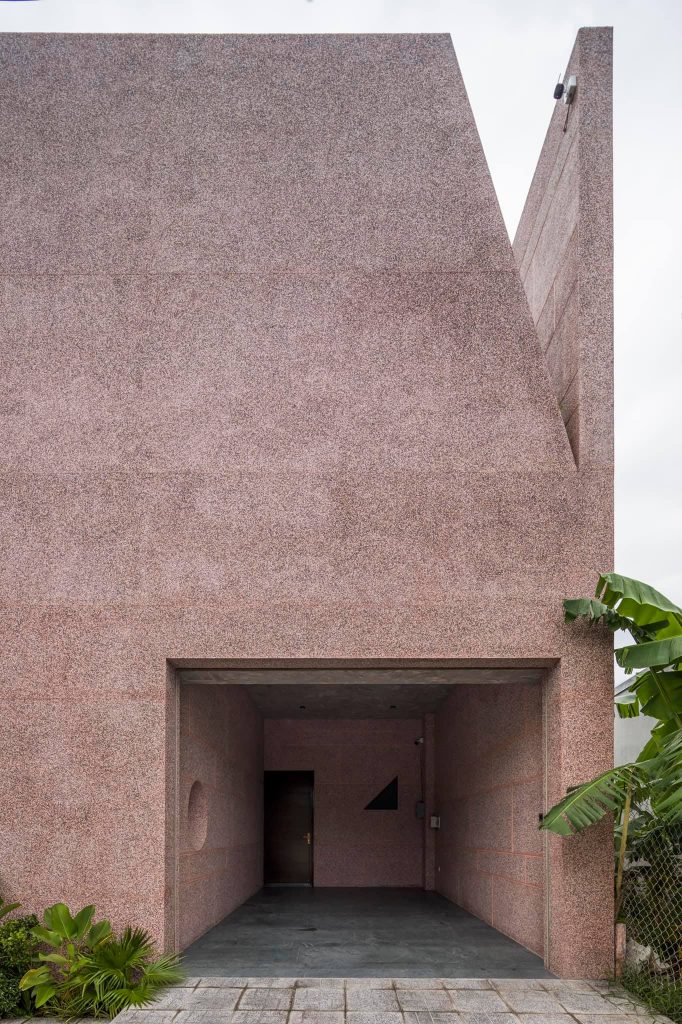 Không gian của Pink House được tách biệt thành các lớp khác nhau bằng vật liệu đá granit đồng nhất bên trong và bên ngoài, làm mờ ranh giới, chỉ có chủ thể và bầu không khí xung quanh chủ thể tạo thành khối. Mặt bằng được tính toán theo mục đích sử dụng và từng hoạt động diễn ra.