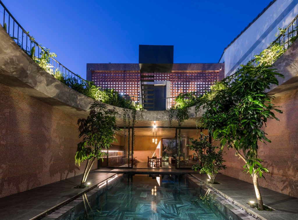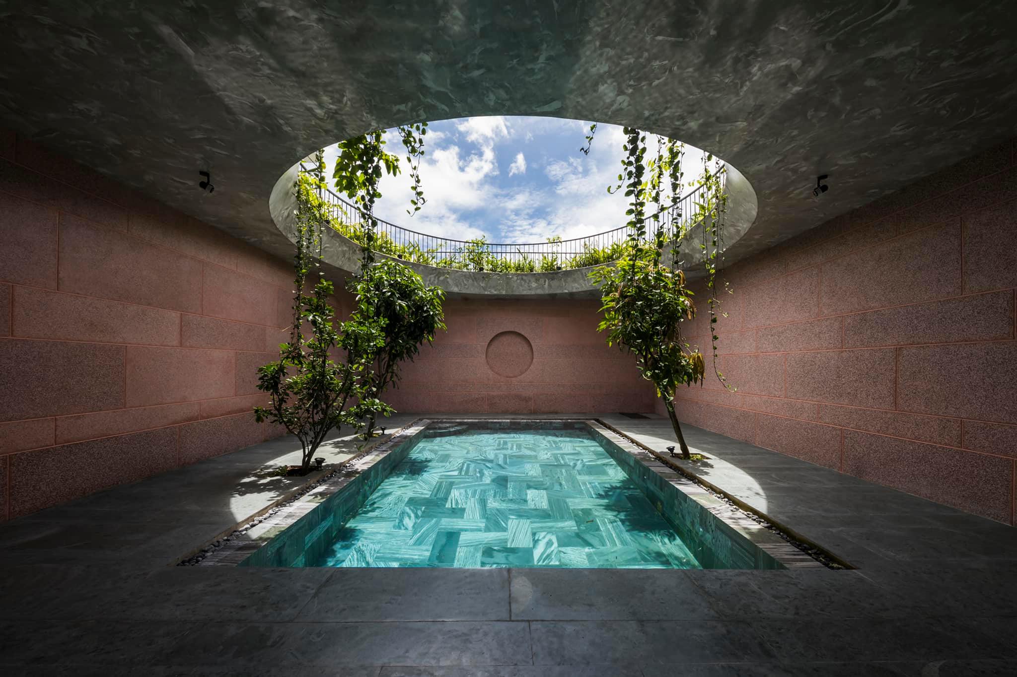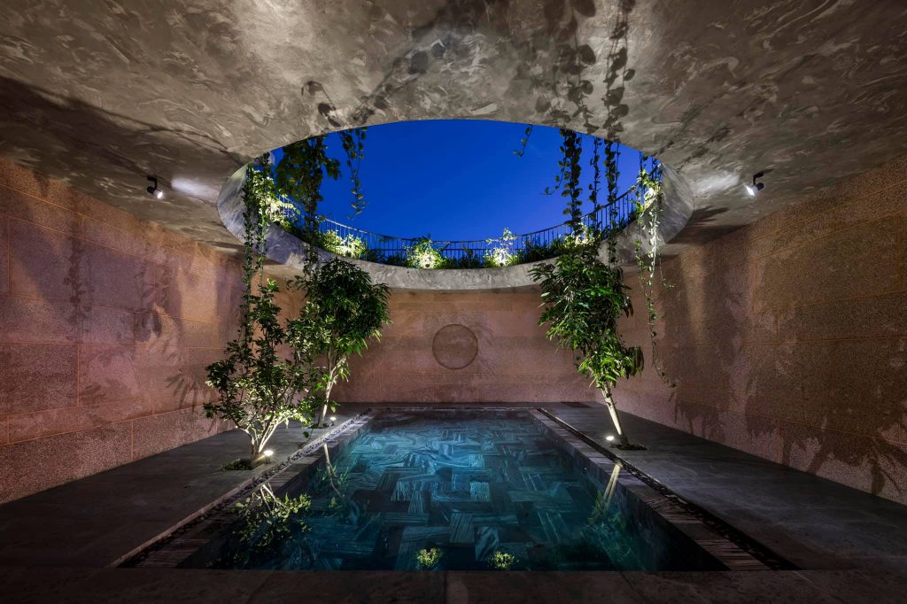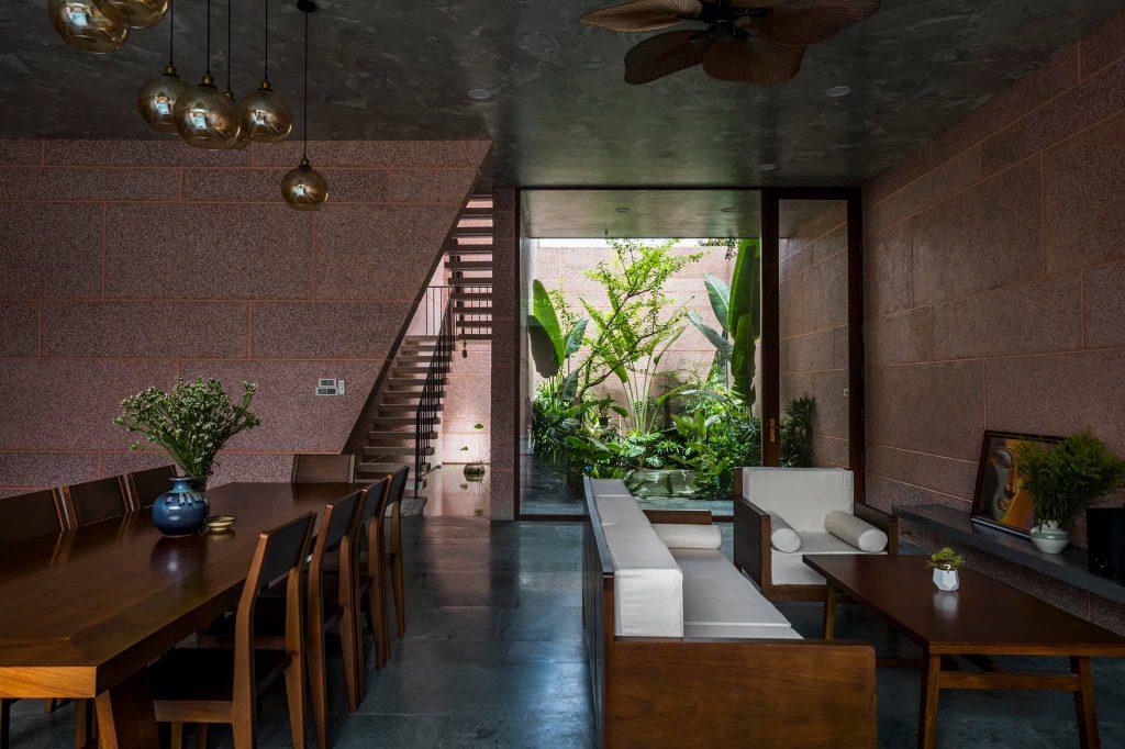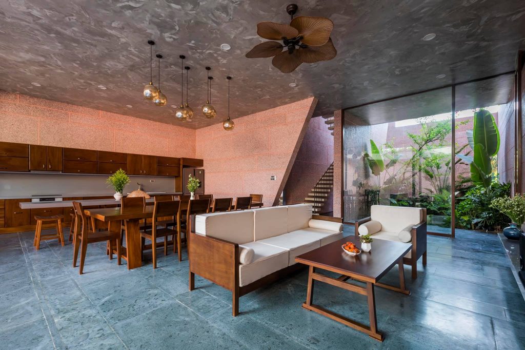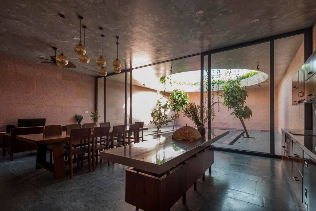 Phòng khách và khu bếp ăn được liên kết, mở ra toàn cảnh hướng ra hồ bơi, nơi chuyển tiếp ánh sáng giữa ngày và đêm. Công trình được thiết kế theo trục đứng của mặt bằng, các phòng ngủ đều có không gian riêng và cảm nhận khác biệt. Mỗi góc khuất trong ngôi nhà đều là nơi để chiêm nghiệm tận hưởng những giá trị thiên nhiên.