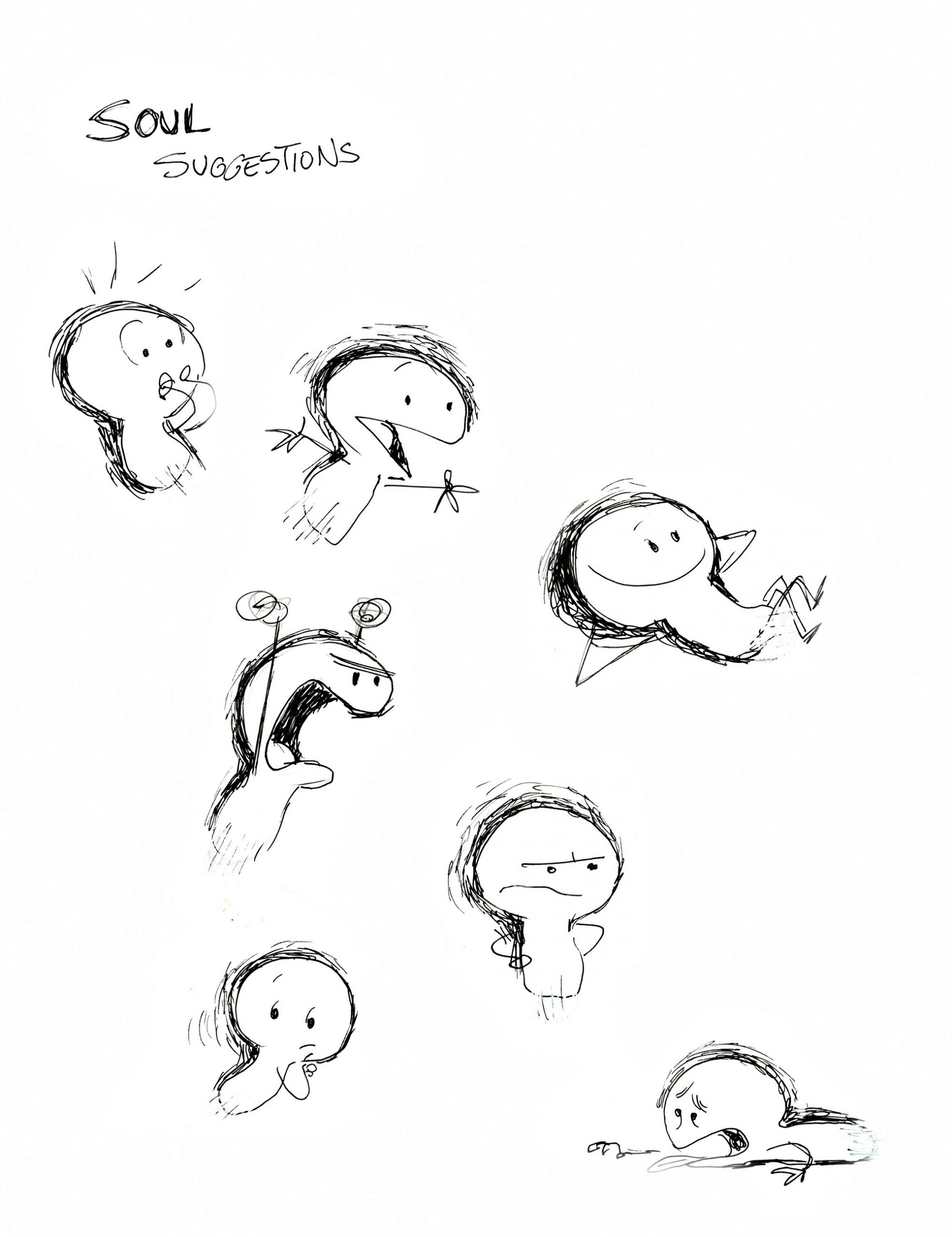 Điều đầu tiên mà những nhà sáng tạo ở Pixar cần phải tìm ra đó là cách hình dung cũng như thể hiện các linh hồn. Đã có rất nhiều nghiên cứu được thực hiện, và một điều mà đạo diễn Pete Docter nhận thấy sau những cuộc nghiên cứu này đó chính là “đa số mọi người mô tả linh hồn như một dạng không khí hư vô, phi vật chất, vô hình. Tất cả đều rất thú vị, nhưng thực sự không hữu ích lắm, vì làm thế nào để bạn vẽ không khí đây?” Đoàn làm phim đã tìm hiểu đủ mọi loại nghiên cứu, thậm chí còn lấy cảm hứng từ khoa học đằng sau chất aerogel, loại vật liệu rắn nhẹ nhất trên Trái đất, được sử dụng trong ngành hàng không vũ trụ. “Tuy nhiên chúng tôi vẫn cảm thấy mình cần tính người hơn cho nhân vật, như những nét mặt rõ ràng mà chúng ta có thể dễ dàng nhận ra bằng biểu cảm và thái độ. Vì vậy, chúng tôi đã quay lại bức vẽ này của Pete từ những giai đoạn ban đầu, thể hiện được sự phù du nhưng vẫn có hình dáng khuôn mặt người trong đó, ”nhà sản xuất Dana Murray giải thích.