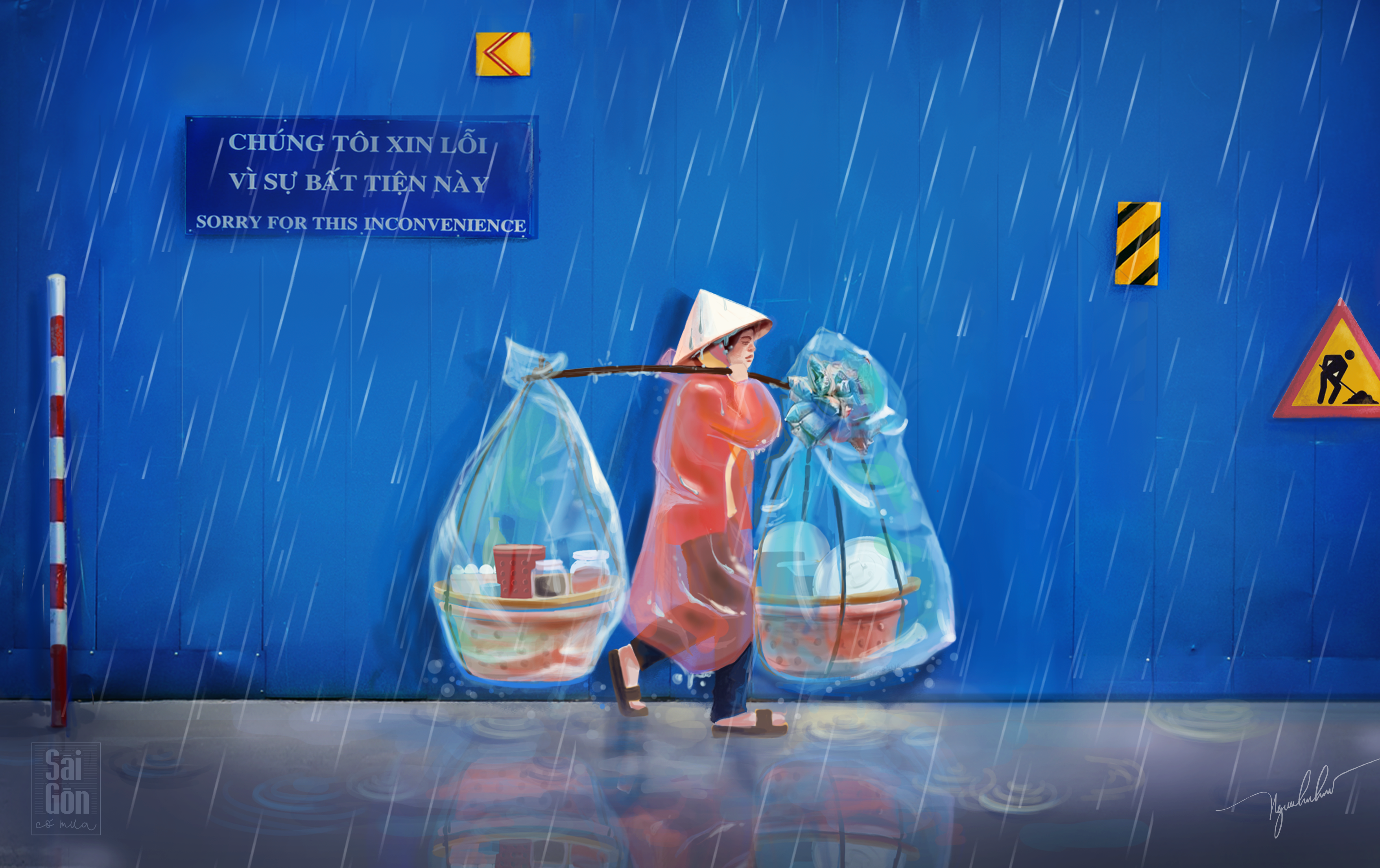 Ở trong lòng những cơn mưa ấy, những hình ảnh quen thuộc vẫn xuất hiện khắp mọi nẻo đường. Đó có thể là một xe hàng rong ở góc đường, có thể là chú xe ôm âm thầm mưu sinh trong mưa, đó có thể là dòng xe tấp nập và những trái chò nâu bay xoay xoay trên đầu… Tất cả hình ảnh đó được ngưng đọng lại và tạo nên một nhịp sống rất Sài Gòn.