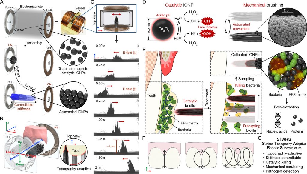 Các robot này có hình dạng như những chiếc bàn chải lông nhỏ xíu, và có thể làm được nhiều hơn chỉ là giúp chúng ta đánh răng. Chúng còn có thể tiết ra chất kháng khuẩn để loại bỏ vi khuẩn có hại trong miệng của bạn nhờ vào các hạt nano oxit sắt – vốn là thành phần cấu tạo nên chúng – để kích hoạt hydrogen-peroxide tạo ra tác nhân tiêu diệt vi khuẩn.
