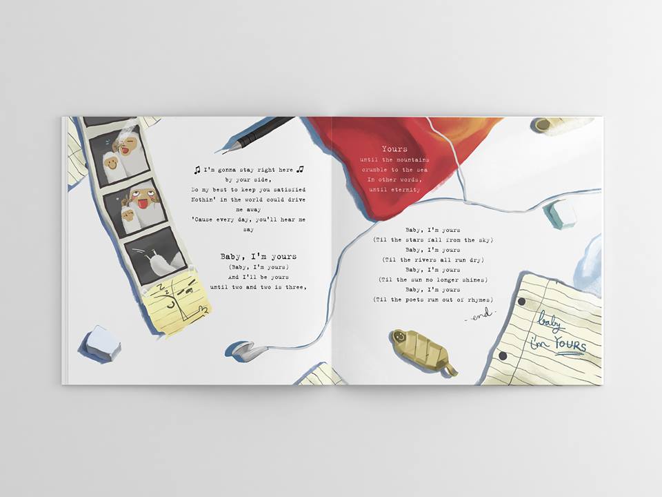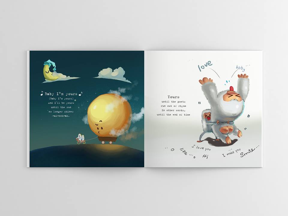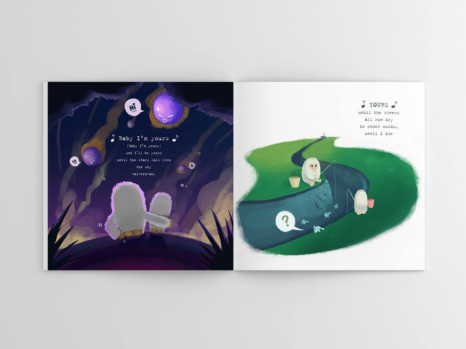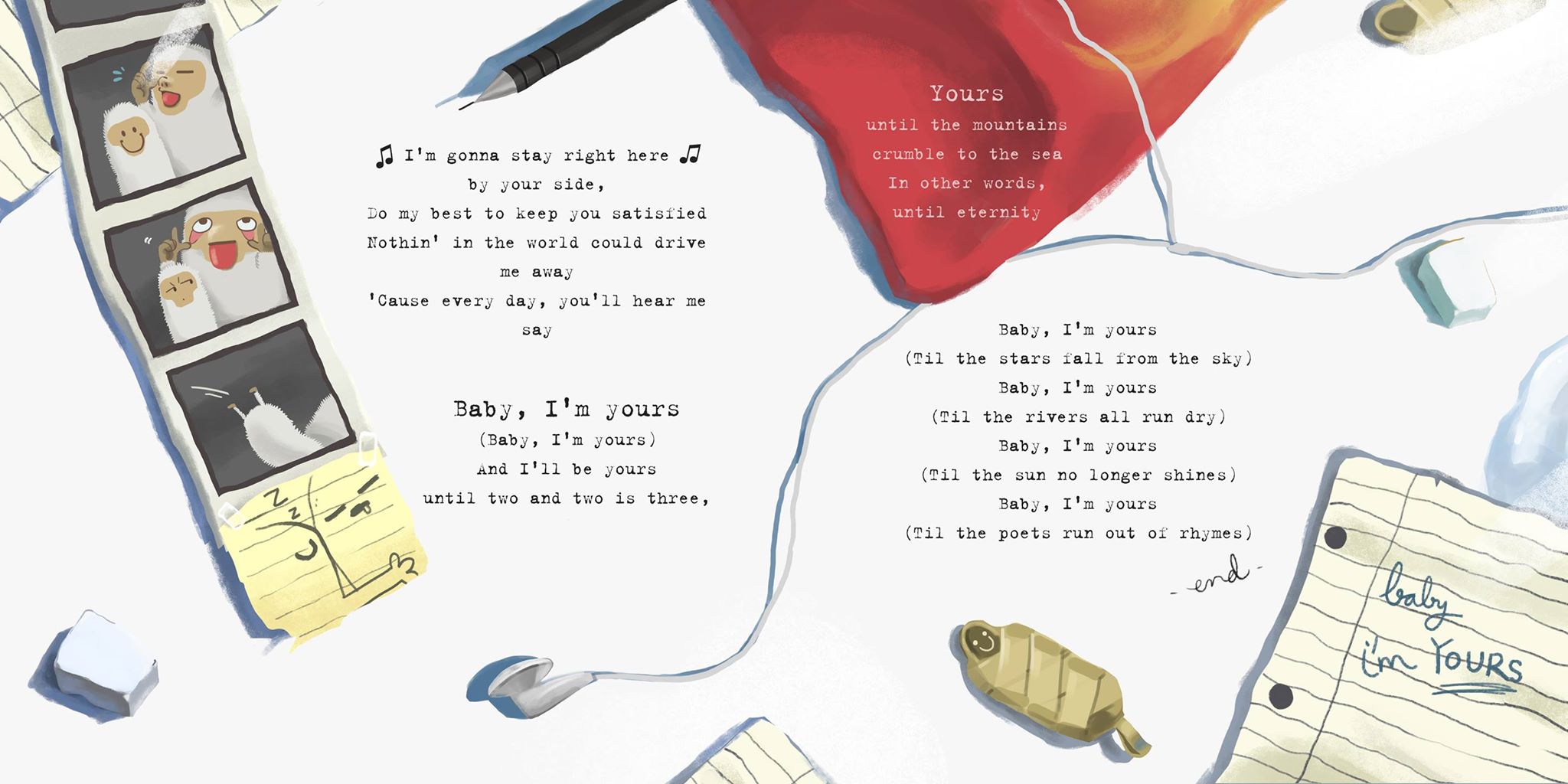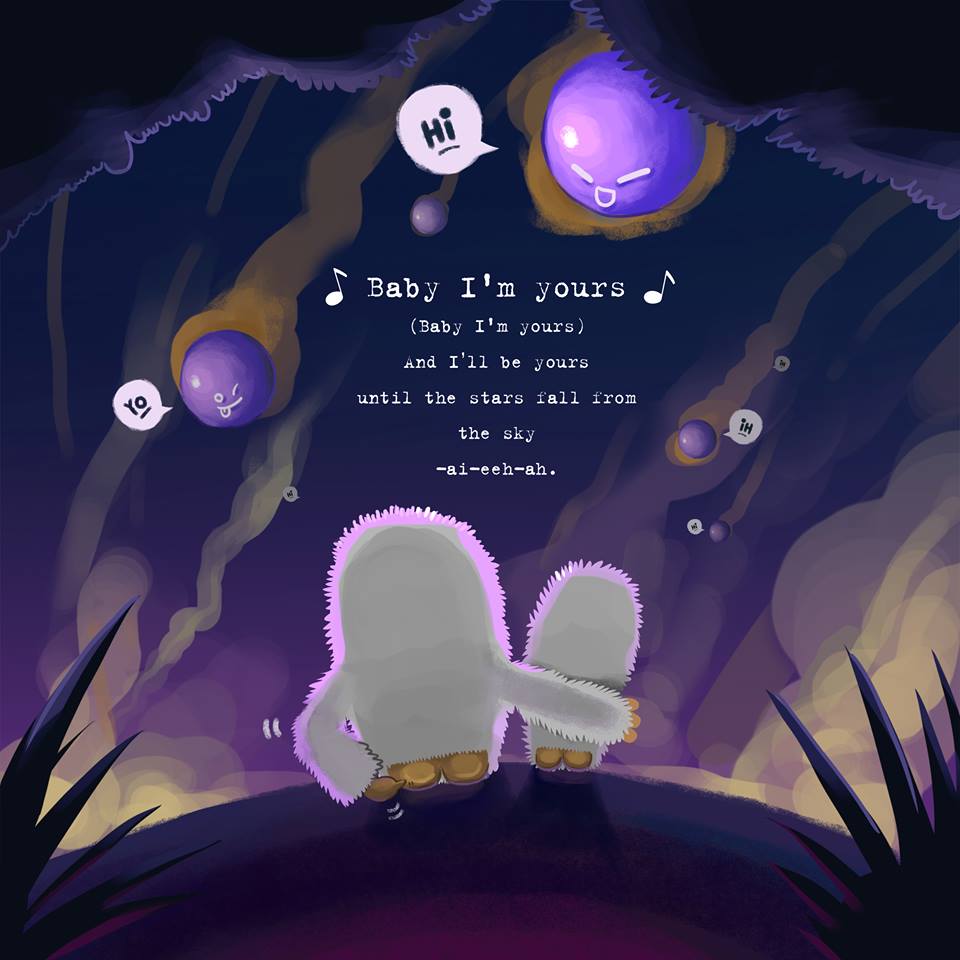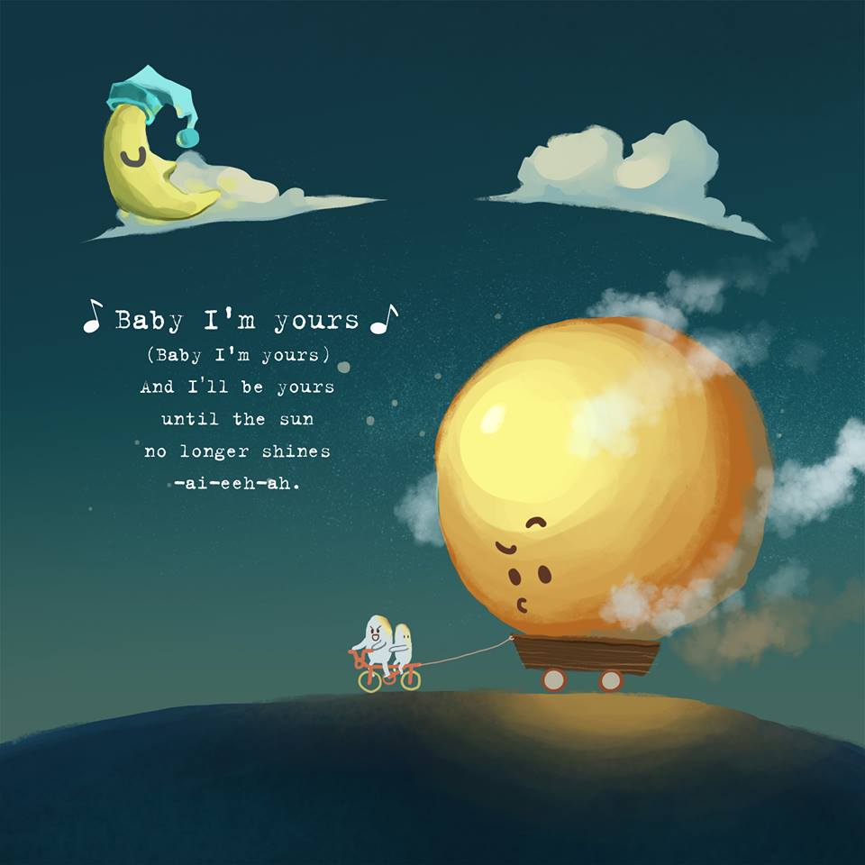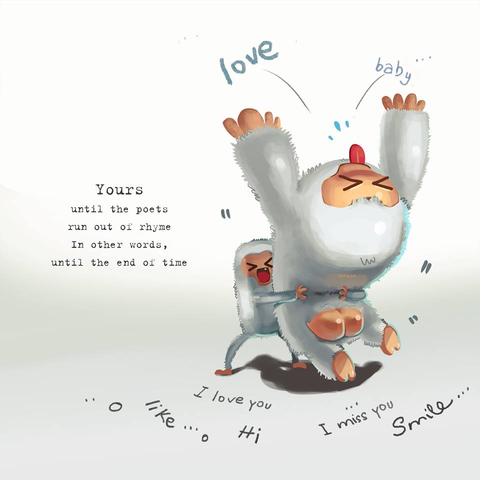 Rồng chia sẻ:” Bài Baby I’m yours là một bài mình rất thích của ban nhạc Arctic Monkeys. Nội dung nghe khá lãng xẹt, nhắng nhít kiểu trẻ con nên chắc bởi vì thế mà mình siêu thích. Bài hát này mình vẽ tặng bạn người yêu mập ú, kể về 2 con khỉ Bắc Cực và mối tình trẻ con vừa lãng mạn vừa lãng xẹt của chúng nó.”