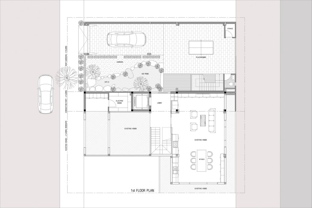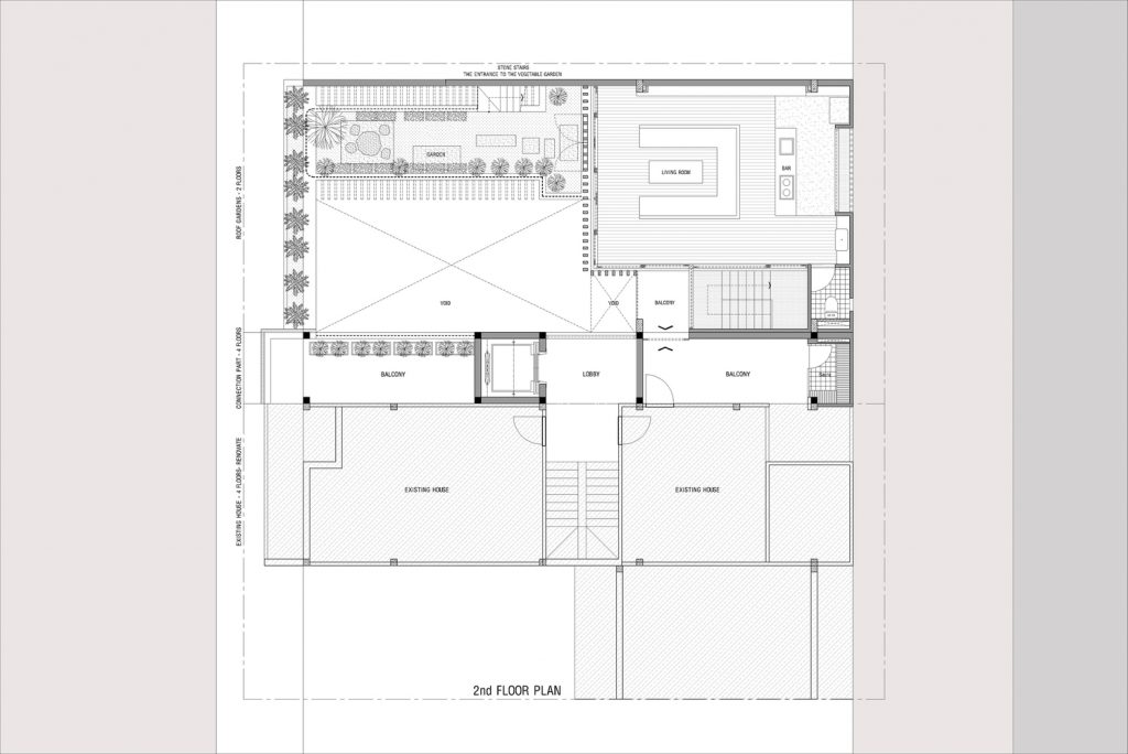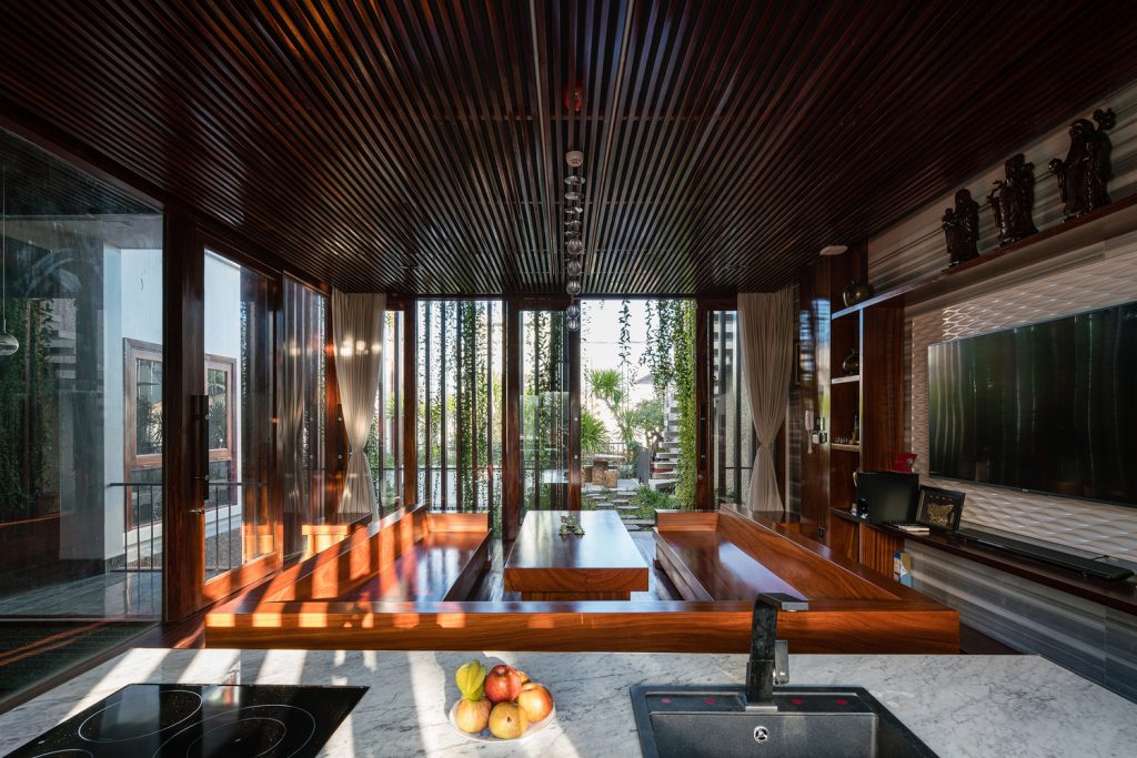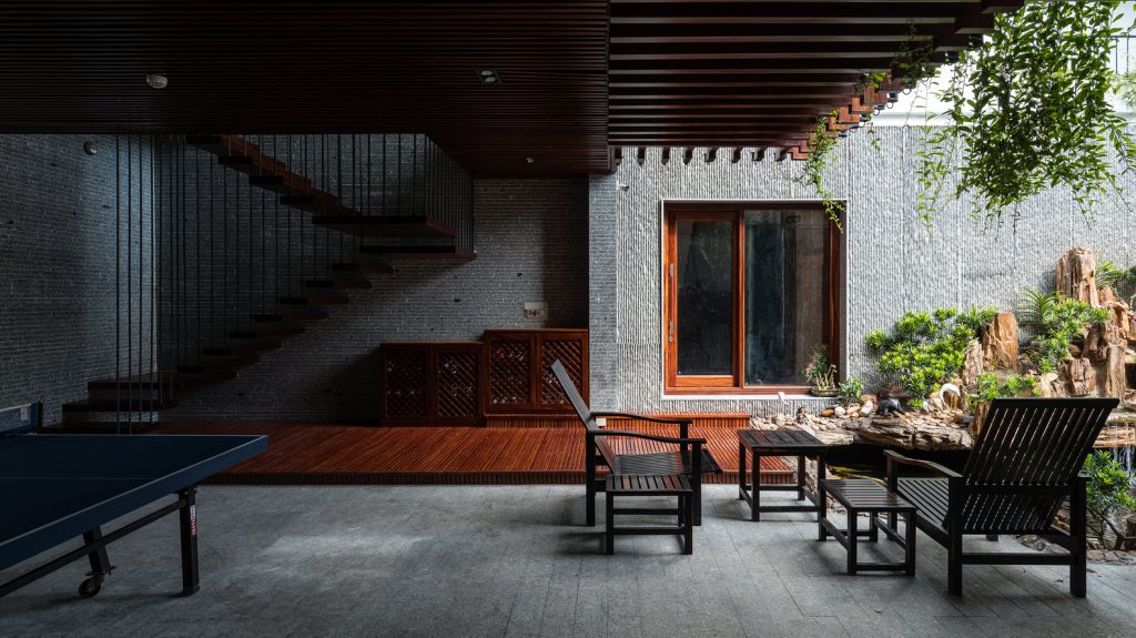 Thay vì có một khoảng sân rộng như những ngôi nhà trong làng, Ladesignstudio tạo ra nhiều khoảng sân ở các độ cao khác nhau, phù hợp với cơ cấu xây dựng theo chiều cao. Tầng lửng tạo ra một khoảng sân phía ngoài để kết nối với sân giữa của ngôi nhà.