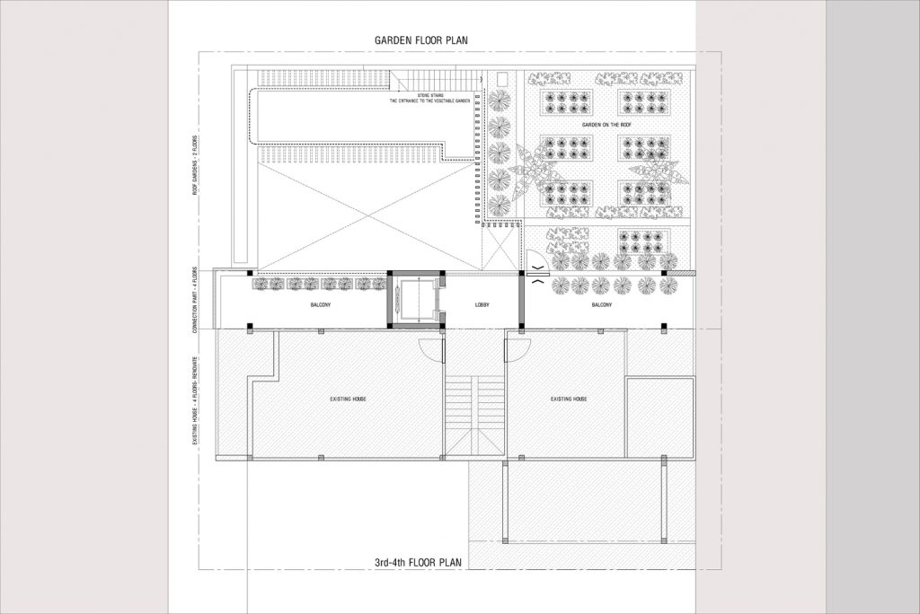 Không gian nông nghiệp trên mái dần chuyển xuống sân trên tầng lửng tạo thành sân chơi kết hợp vườn rau nối từ mái xuống tầng trệt. Khu vườn cung cấp nhiều loại rau quả sạch, là nguồn thực phẩm chính của gia đình cũng như thi thoảng đem biếu bà con lối xóm, tạo nên mối quan hệ cộng đồng trong làng xóm.