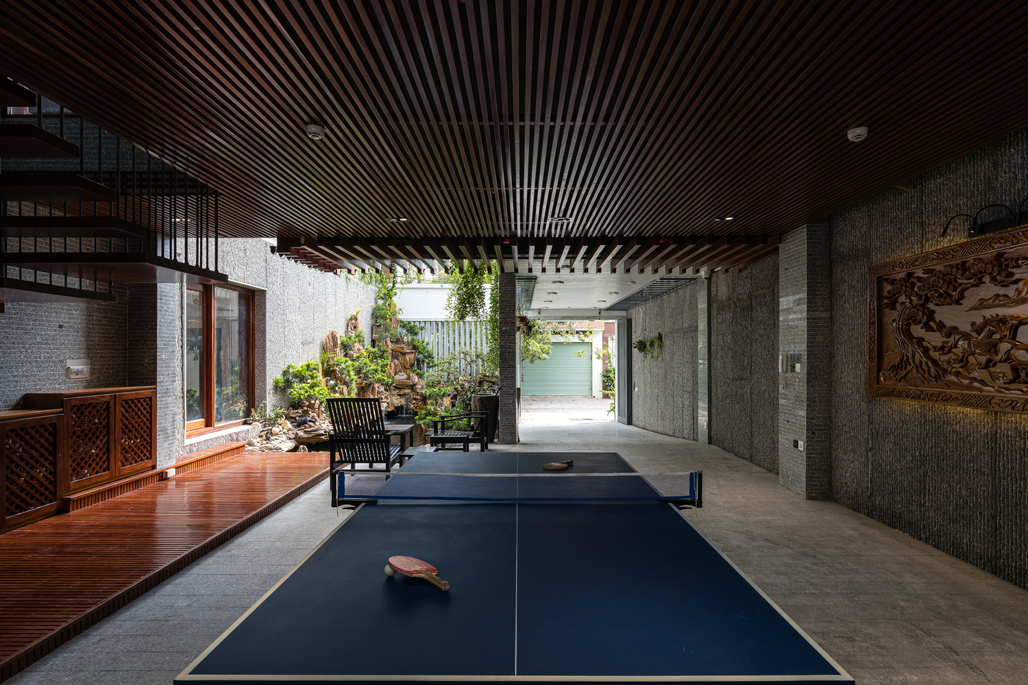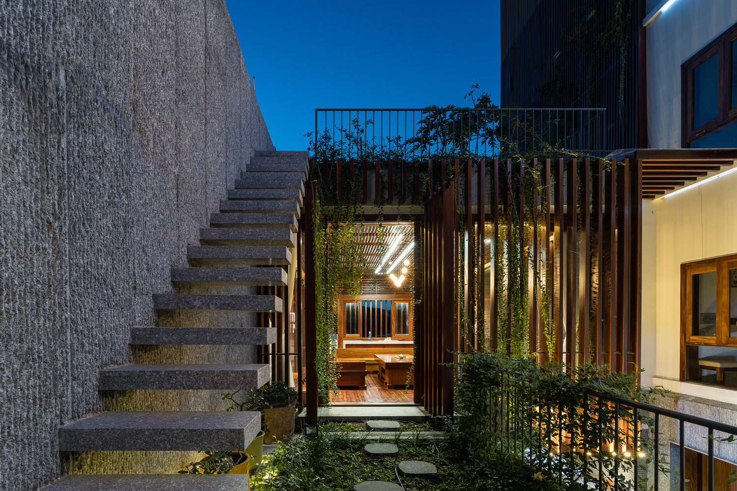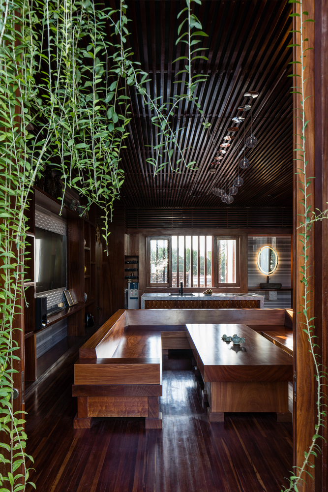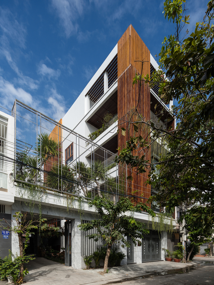 Mặt tiền là những tấm rèm xanh mướt cùng tông màu trầm ấm của gỗ dựa trên kết cấu sẵn có được phân khúc hợp lý, vừa để giảm bức xạ nhiệt vừa mang lại bóng mát và vẻ thơ mộng khi gia chủ trở về nhà sau một ngày làm việc dài.