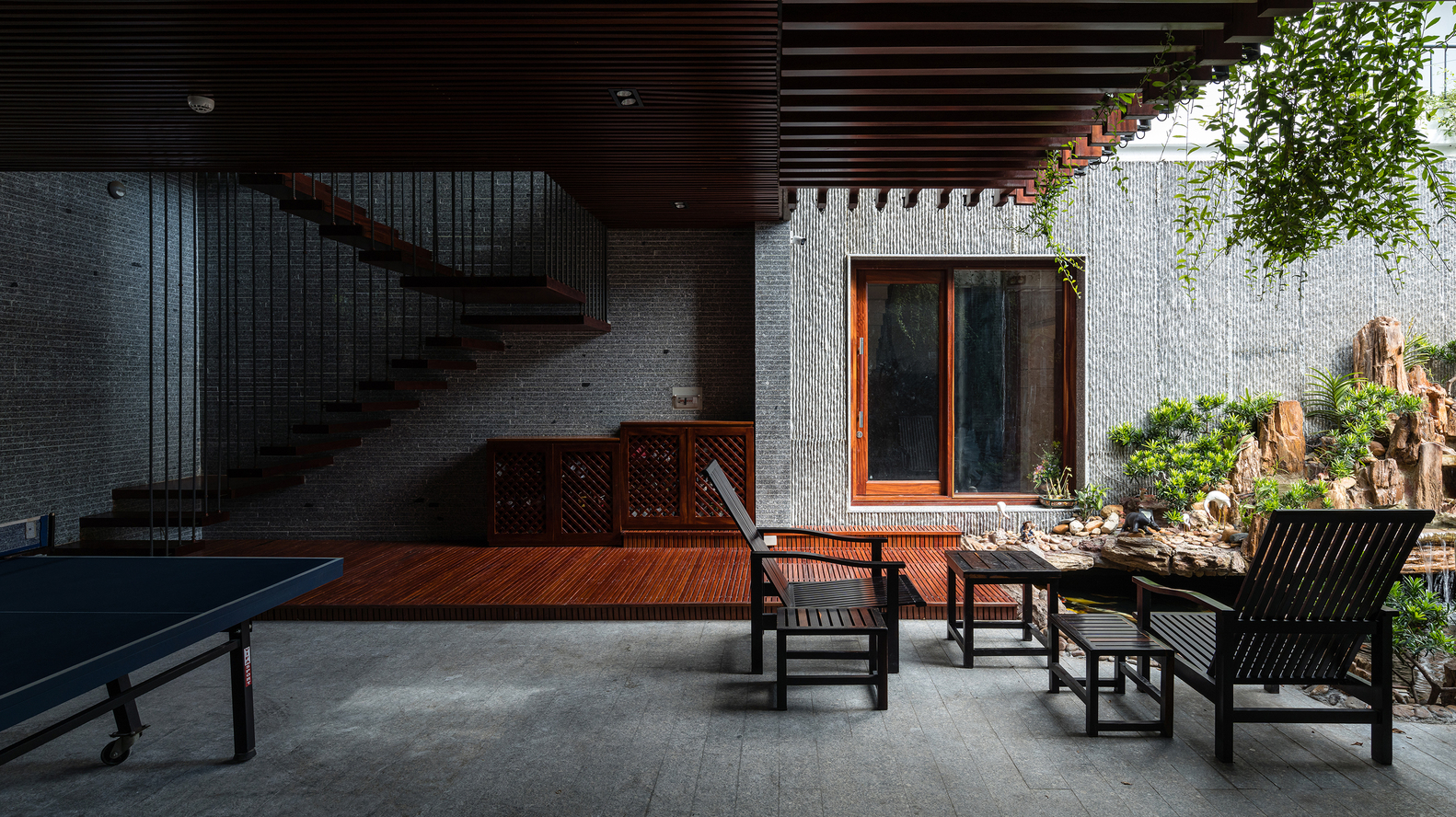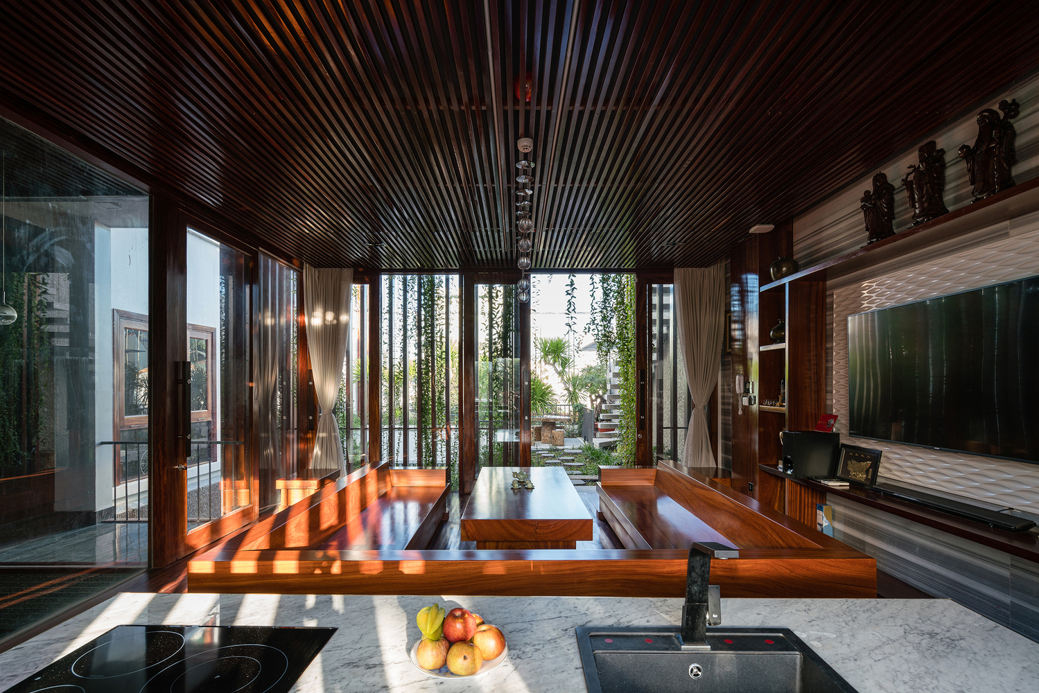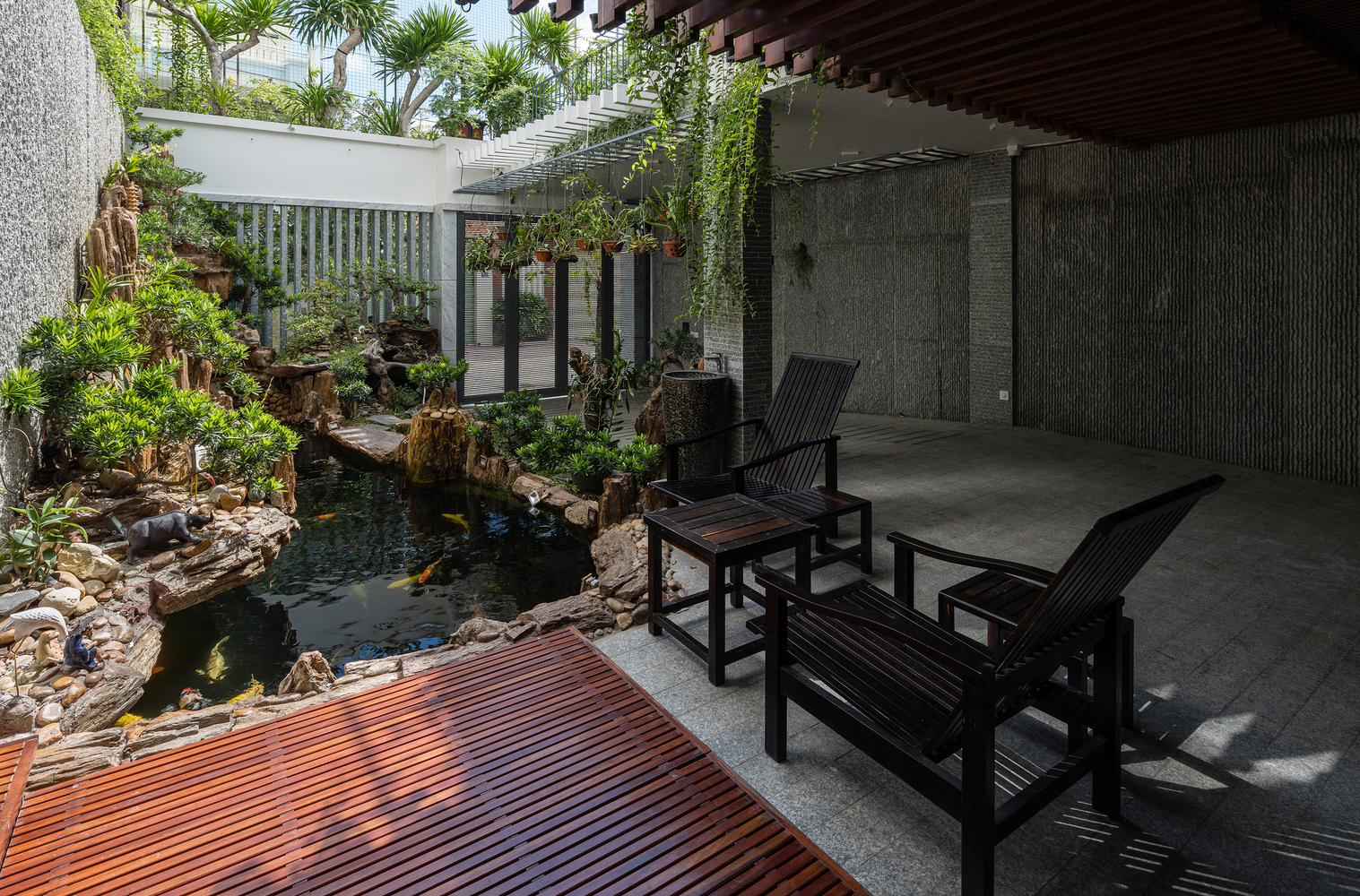Mặt tiền là những tấm rèm xanh mướt cùng tông màu trầm ấm của gỗ dựa trên kết cấu sẵn có được phân khúc hợp lý, vừa để giảm bức xạ nhiệt vừa mang lại bóng mát và vẻ thơ mộng khi gia chủ trở về nhà sau một ngày làm việc dài.