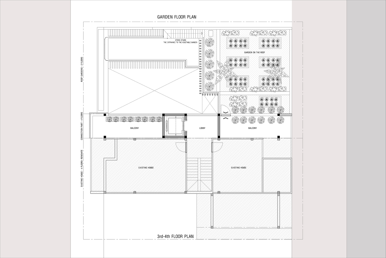 Không gian nông nghiệp trên mái dần chuyển xuống sân trên tầng lửng tạo thành sân chơi kết hợp vườn rau nối từ mái xuống tầng trệt. Khu vườn cung cấp nhiều loại rau quả sạch, là nguồn thực phẩm chính của gia đình cũng như thi thoảng đem biếu bà con lối xóm, tạo nên mối quan hệ cộng đồng trong làng xóm.