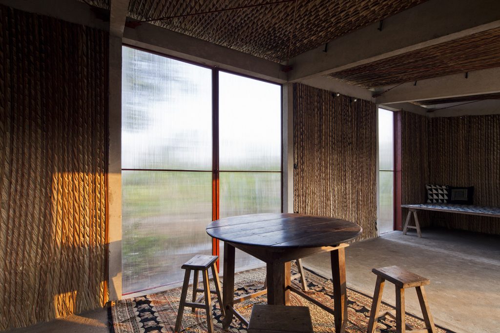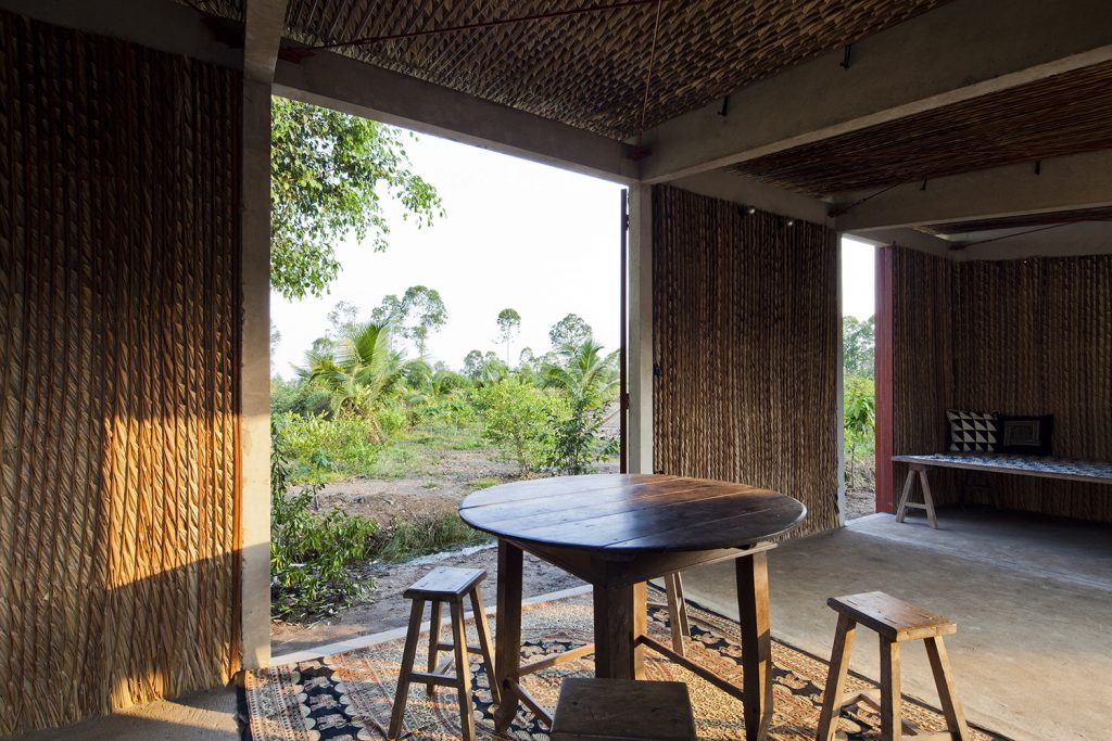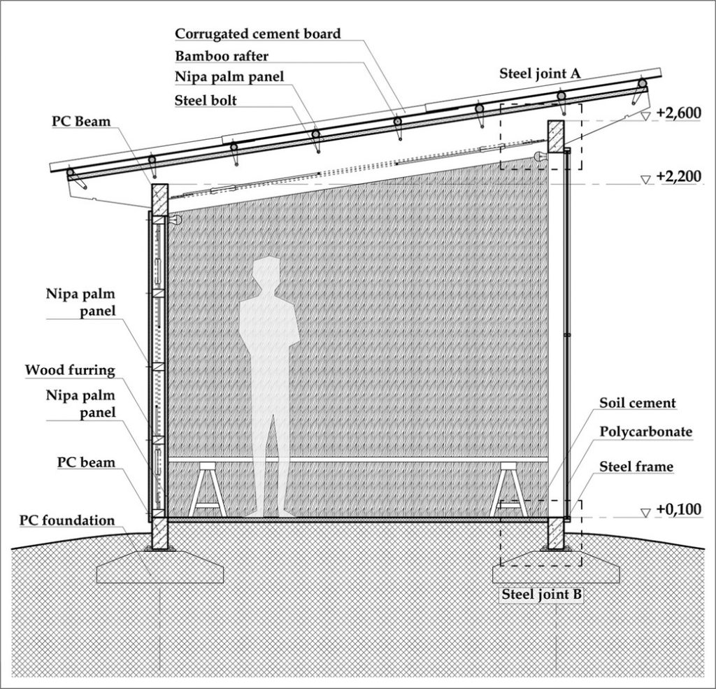 Để đối phó với thời tiết khắc nghiệt của khu vực, dự án sử dụng các chiến lược thiết kế thụ động. Lá dừa nước và xi măng được kết hợp để tạo thành lớp bảo vệ kép, đủ mạnh mẽ cho cơn mưa nặng hạt trong khi vẫn cung cấp đủ sự gọn nhẹ và cách nhiệt vào mùa nắng nóng. Tấm polycarbonate cho phép ánh sáng tự nhiên đi vào và giảm nhu cầu chiếu sáng nhân tạo, trong khi khoảng cách giữa mái và tường là để thông gió tự nhiên. Vì cây dừa nước cực kỳ phổ biến nơi đây và gần như là chẳng tốn chi phí nên nó không chỉ là nguyên liệu quen thuộc với người dân địa phương mà còn hài hòa với cảnh vật xung quanh.