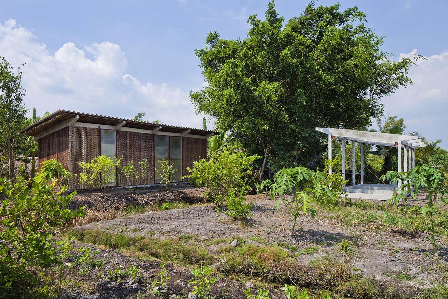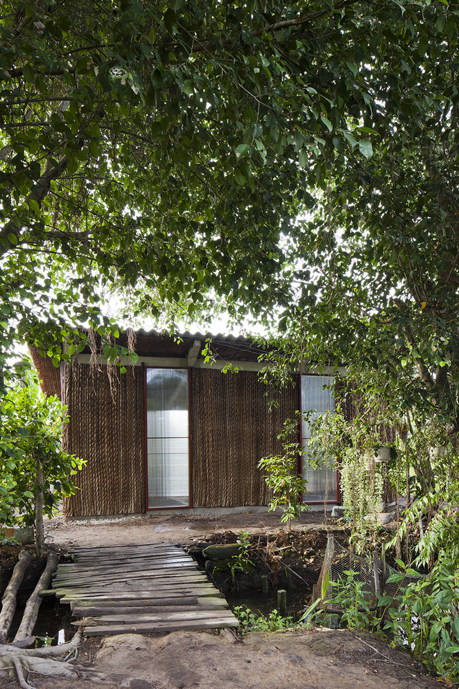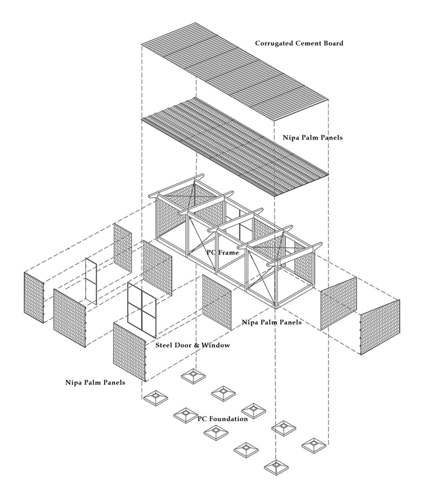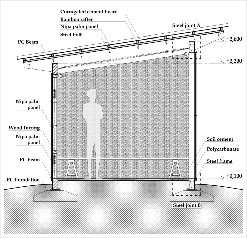 Để đối phó với thời tiết khắc nghiệt của khu vực, dự án sử dụng các chiến lược thiết kế thụ động. Lá dừa nước và xi măng được kết hợp để tạo thành lớp bảo vệ kép, đủ mạnh mẽ cho cơn mưa nặng hạt trong khi vẫn cung cấp đủ sự gọn nhẹ và cách nhiệt vào mùa nắng nóng. Tấm polycarbonate cho phép ánh sáng tự nhiên đi vào và giảm nhu cầu chiếu sáng nhân tạo, trong khi khoảng cách giữa mái và tường là để thông gió tự nhiên. Vì cây dừa nước cực kỳ phổ biến nơi đây và gần như là chẳng tốn chi phí nên nó không chỉ là nguyên liệu quen thuộc với người dân địa phương mà còn hài hòa với cảnh vật xung quanh.