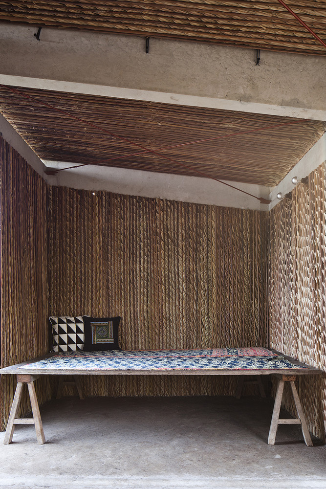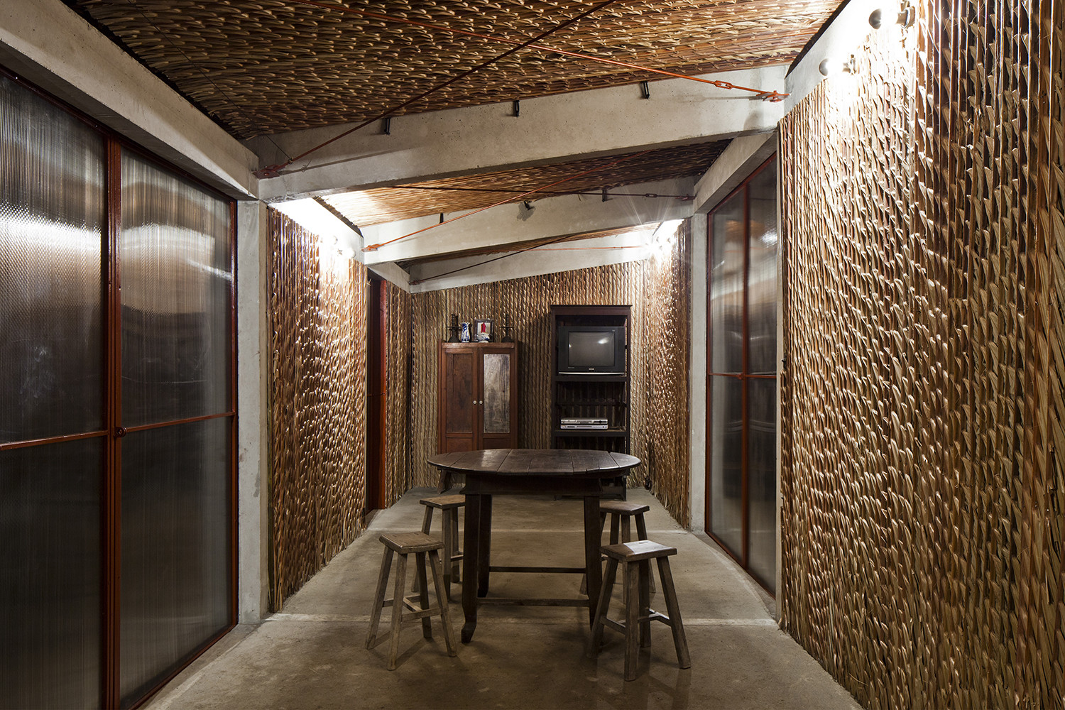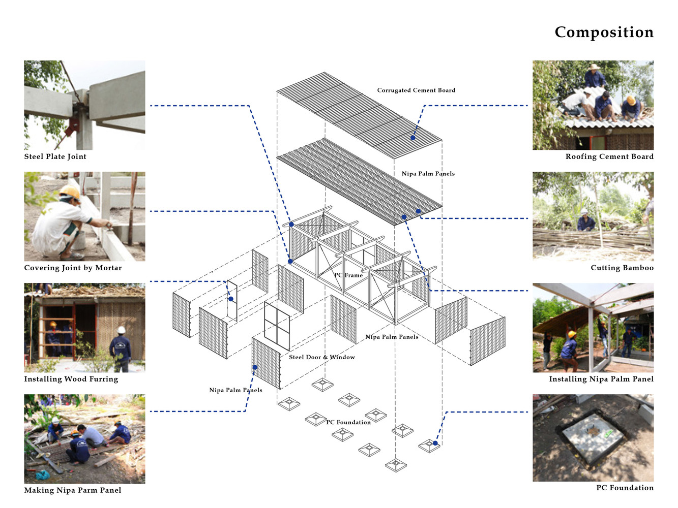 Để đối phó với thời tiết khắc nghiệt của khu vực, dự án sử dụng các chiến lược thiết kế thụ động. Lá dừa nước và xi măng được kết hợp để tạo thành lớp bảo vệ kép, đủ mạnh mẽ cho cơn mưa nặng hạt trong khi vẫn cung cấp đủ sự gọn nhẹ và cách nhiệt vào mùa nắng nóng. Tấm polycarbonate cho phép ánh sáng tự nhiên đi vào và giảm nhu cầu chiếu sáng nhân tạo, trong khi khoảng cách giữa mái và tường là để thông gió tự nhiên. Vì cây dừa nước cực kỳ phổ biến nơi đây và gần như là chẳng tốn chi phí nên nó không chỉ là nguyên liệu quen thuộc với người dân địa phương mà còn hài hòa với cảnh vật xung quanh.