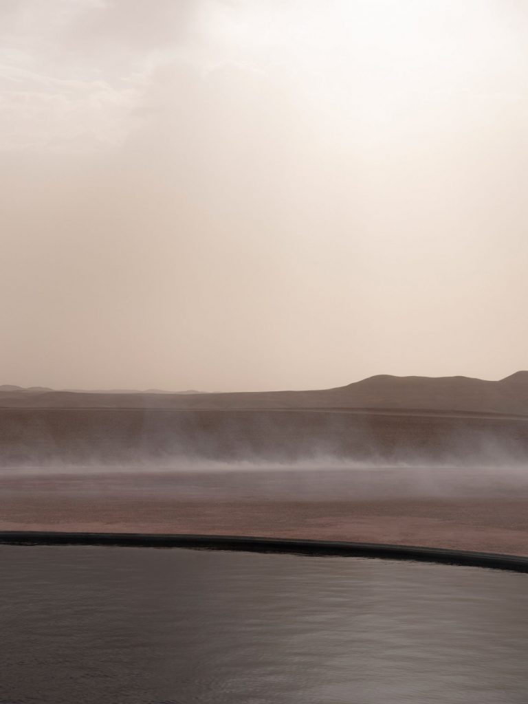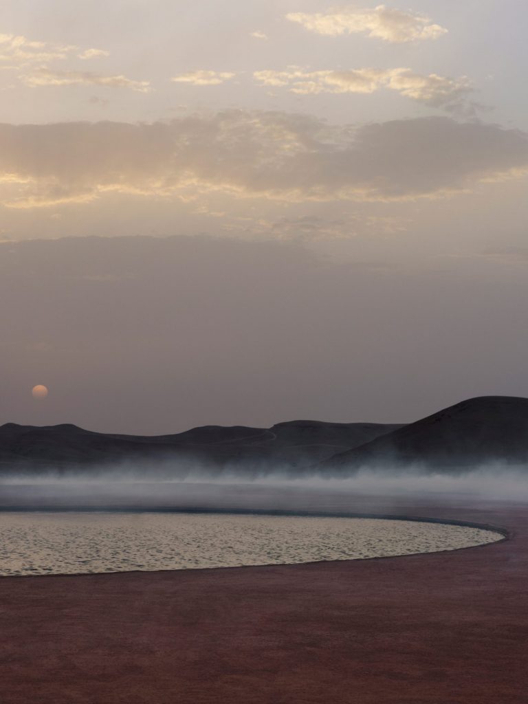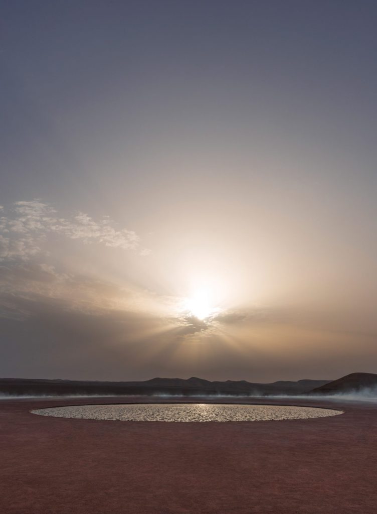 Devlin đã tạo ra một hàng rào tráng gương bao quanh những dãy ghế đẩu bằng đá màu đỏ đầy bụi do các nghệ nhân địa phương tạo ra, cũng như một cái ao nước nhỏ kiêm ốc đảo hình tròn ở trung tâm của sàn diễn.