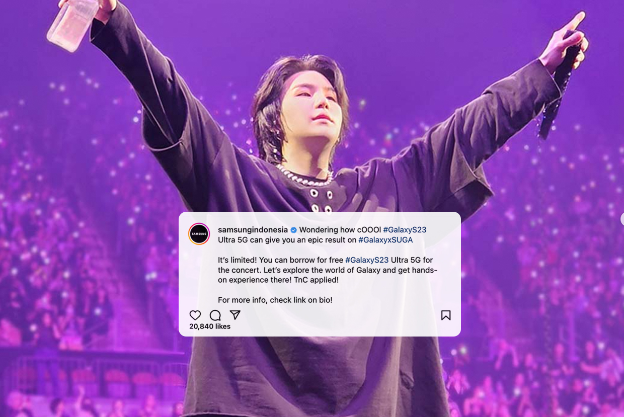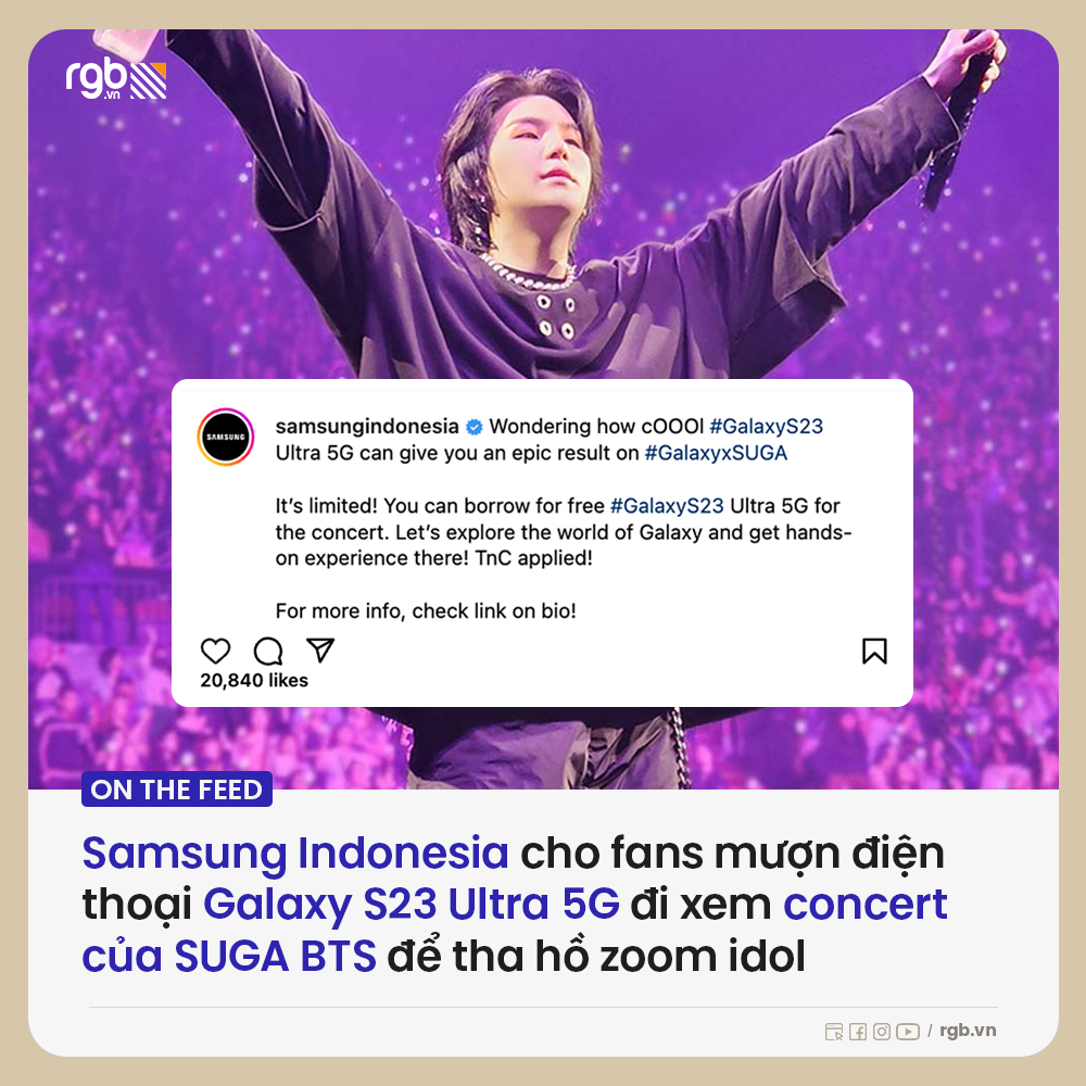 Nhân dịp concert solo của Suga – thành viên BTS sẽ được tổ chức tại Jakarta vào 26 đến 28/5, Samsung Indonesia bất ngờ tuyên bố sẽ cho fans mượn điện thoại Galaxy S23 Ultra 5G để tận hưởng buổi biểu diễn.