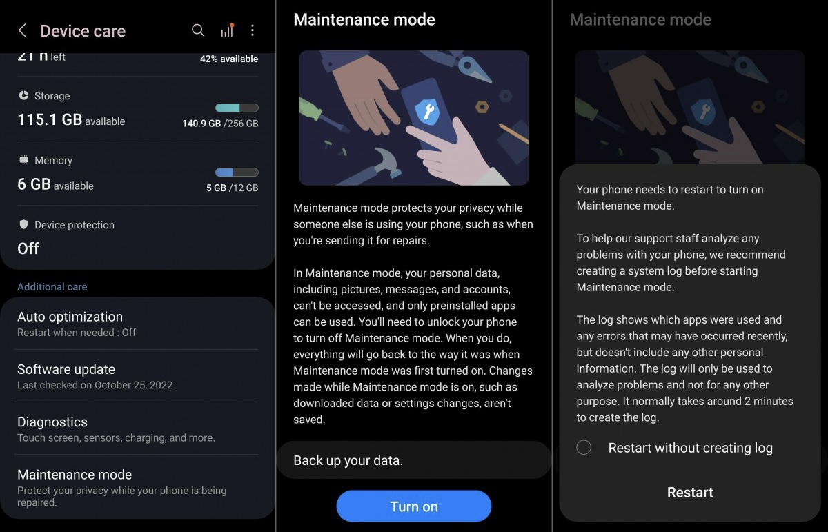 Tính năng này có thể được tìm thấy tại mục Settings > Battery > Device Care. Sau khi bật nó lên, điện thoại sẽ khởi động lại và sẵn sàng để đưa cho người sửa chữa.