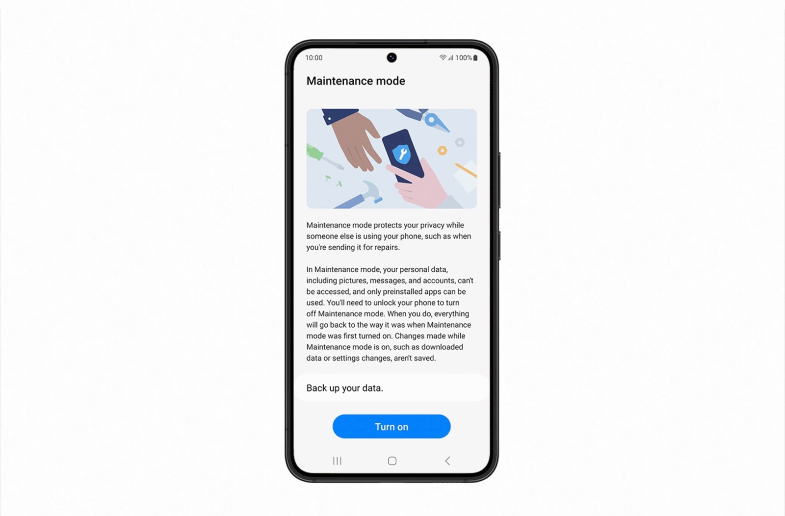Hiểu được nỗi lo lắng này, Samsung vừa cho phát hành tính năng mới có tên Maintenance Mode (Chế độ Bảo trì) giúp bạn an tâm đem điện thoại đi bảo dưỡng mà không cần phải xoá hết tất cả dữ liệu trong đó.