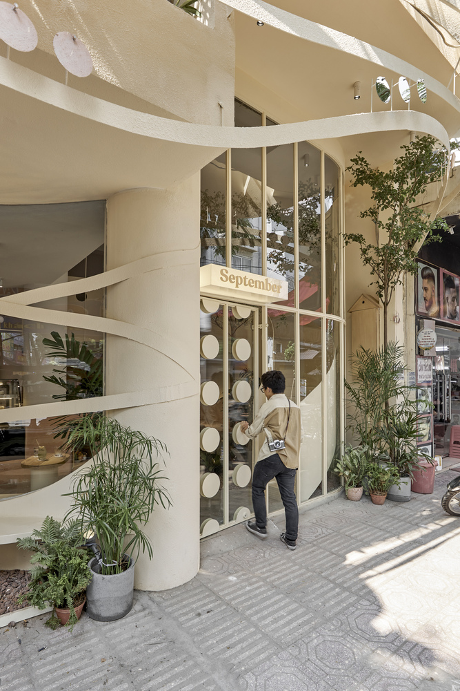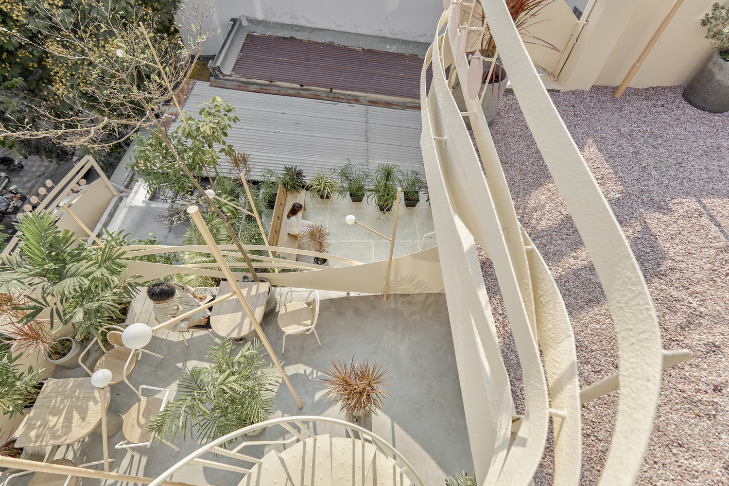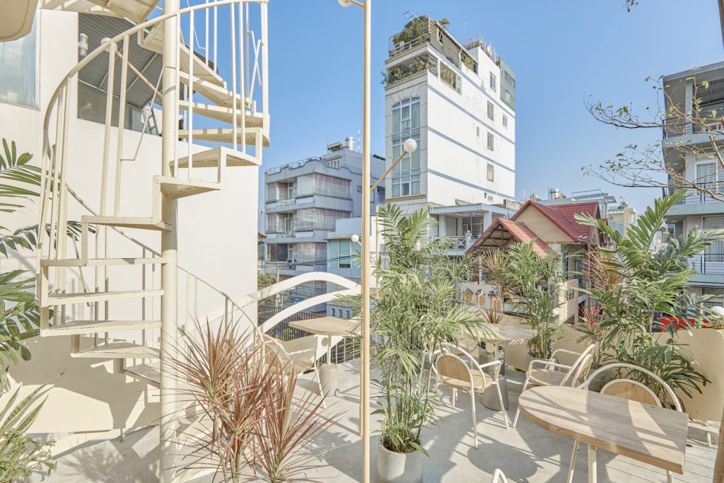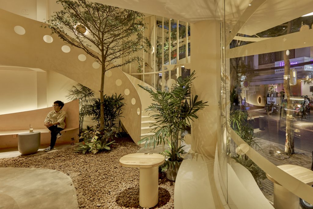 Về cách bố trí không gian, tầng trệt với tinh thần đưa sân vườn vào nhà tạo cảm giác “trong nhà mà ngoài trời” thích hợp cho khách ngồi nhanh hoặc ngồi quanh quán nhìn khu pha chế. Khu vực tầng 2 và tầng 3 dành cho những người ngồi lâu hơn hoặc đi theo nhóm.