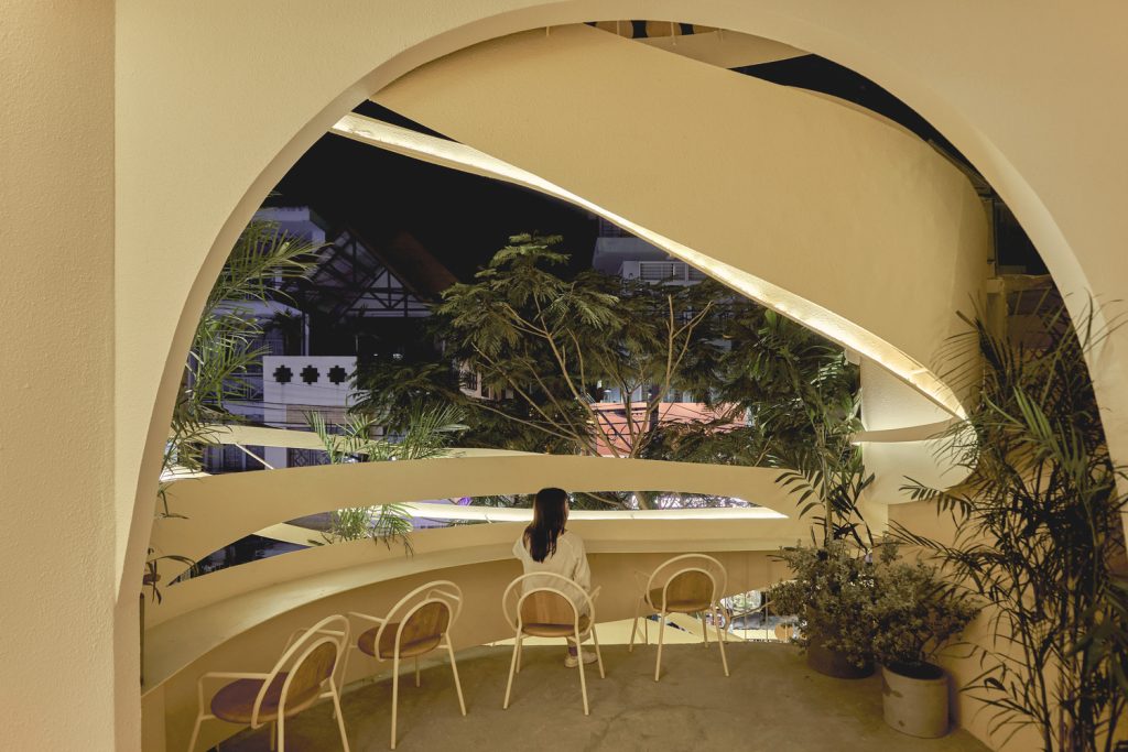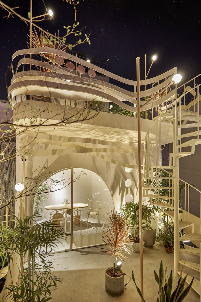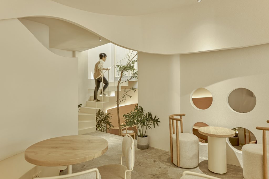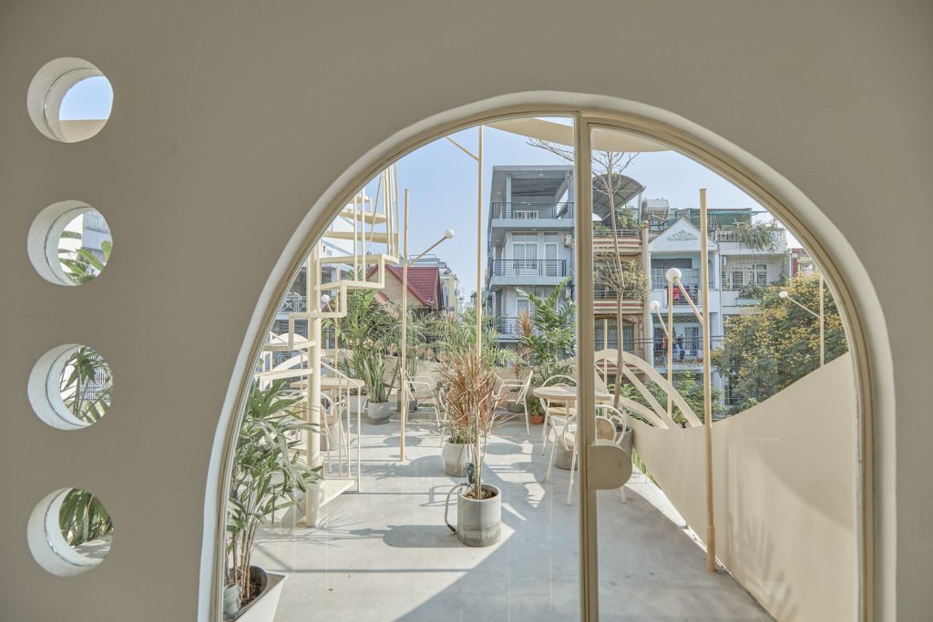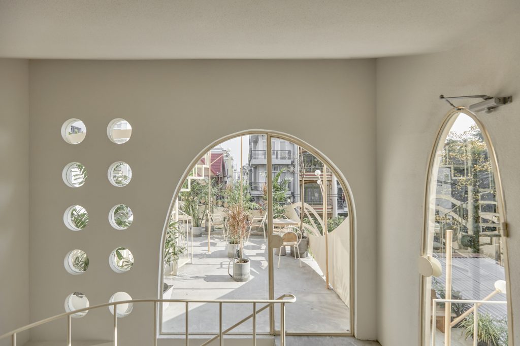 Bên cạnh đó, hình ảnh tròn và đường cong gợi nhớ qua các lỗ kính của cửa ra vào, cầu thang, trên tường hay thậm chí chỉ là những chi tiết nhỏ trên bàn ghế, hình ảnh của gió được dẫn dắt bởi những đường cong trong không gian, xuyên qua trần, tường, sàn tạo cảm giác nhẹ nhàng như làn gió thoảng vào từng ngóc ngách.