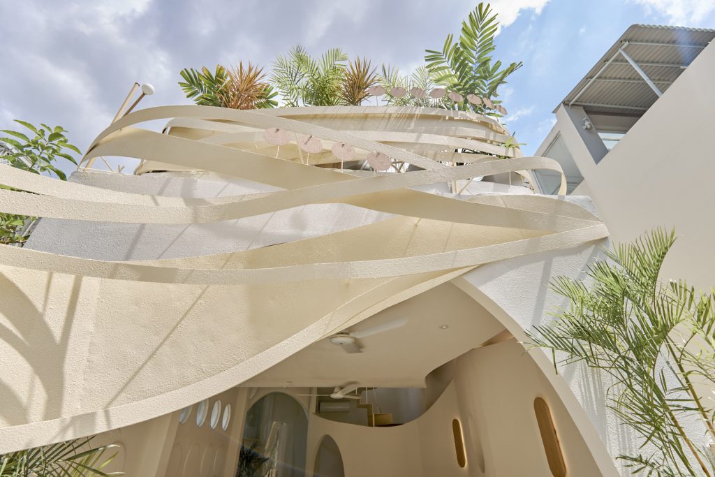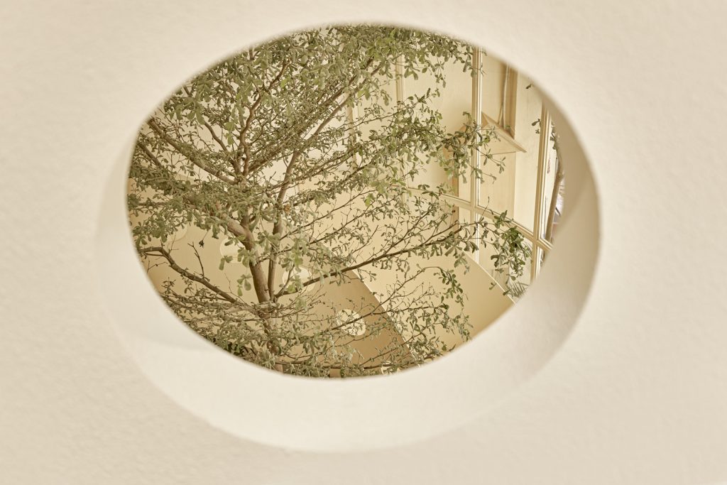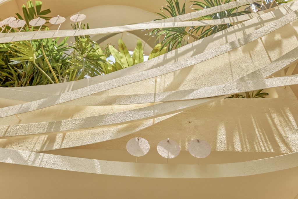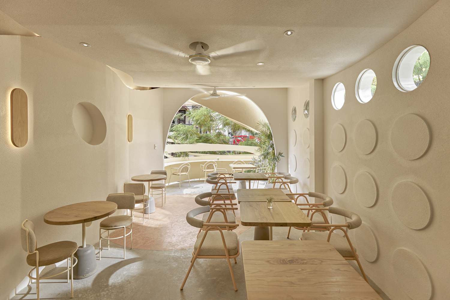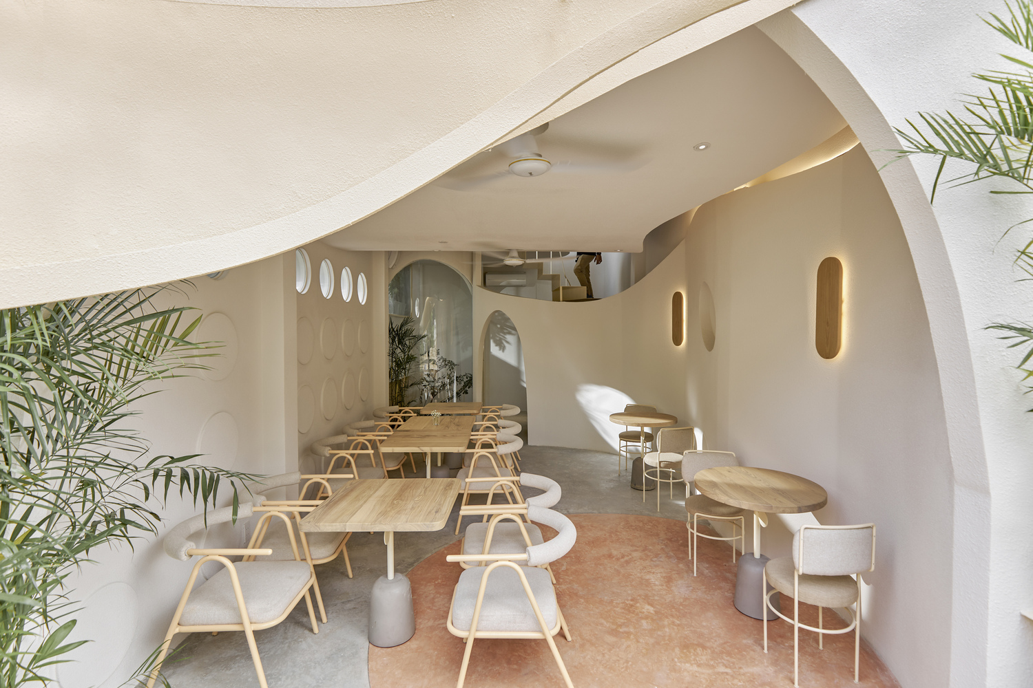 Bên cạnh đó, hình ảnh tròn và đường cong gợi nhớ qua các lỗ kính của cửa ra vào, cầu thang, trên tường hay thậm chí chỉ là những chi tiết nhỏ trên bàn ghế, hình ảnh của gió được dẫn dắt bởi những đường cong trong không gian, xuyên qua trần, tường, sàn tạo cảm giác nhẹ nhàng như làn gió thoảng vào từng ngóc ngách.