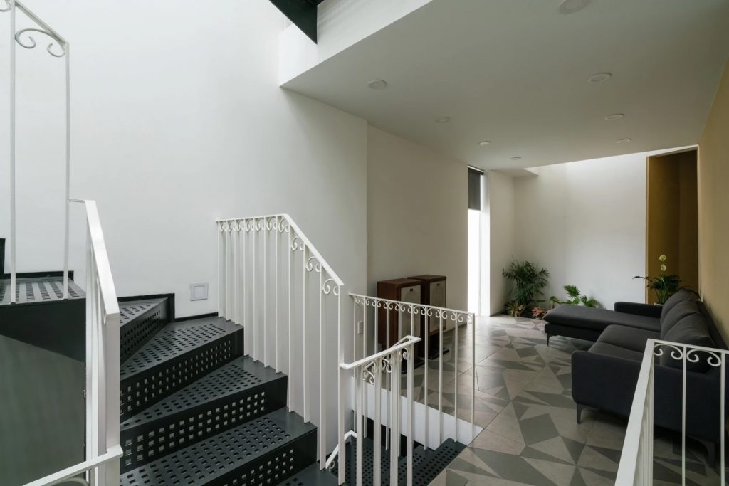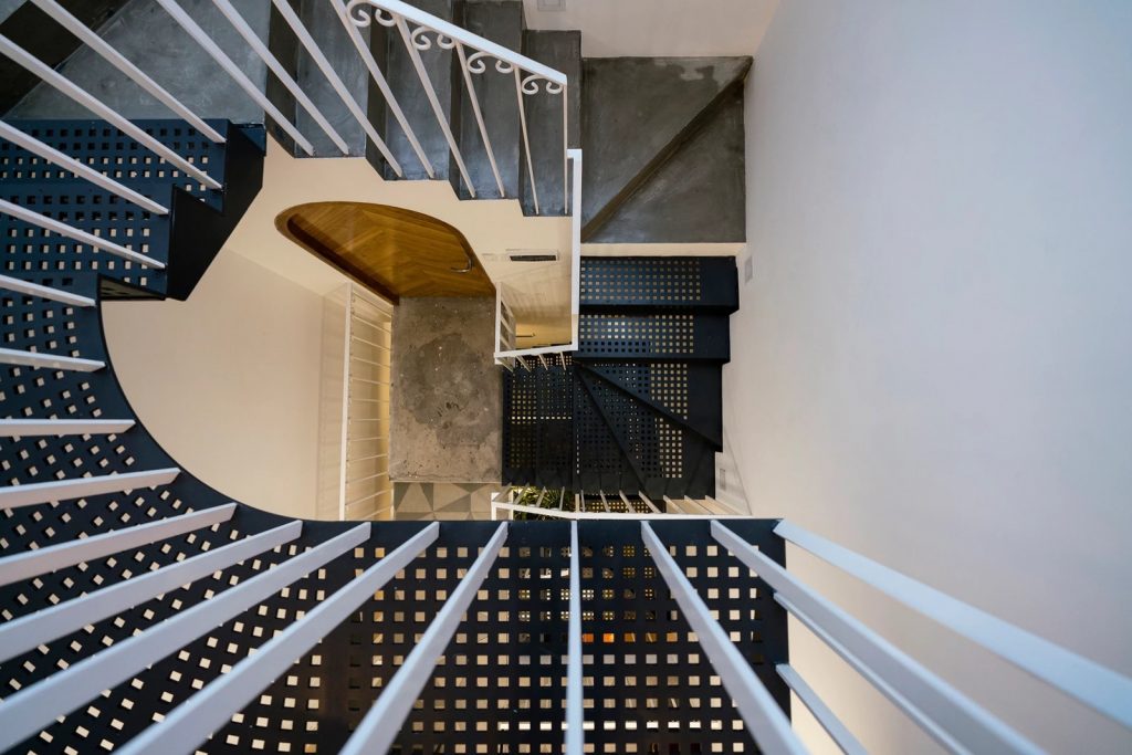 Cầu thang thay đổi linh hoạt theo cao độ và vị trí tương ứng giữa các sàn, nương theo chiều xiên của lõi thông tầng. Thân thang, mặt bậc sử dụng vật liệu có khả năng xuyên sáng một phần, cho phép ánh sáng len lỏi, tạo ra hiệu ứng bóng đổ lên những bề mặt xung quanh.