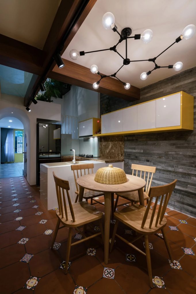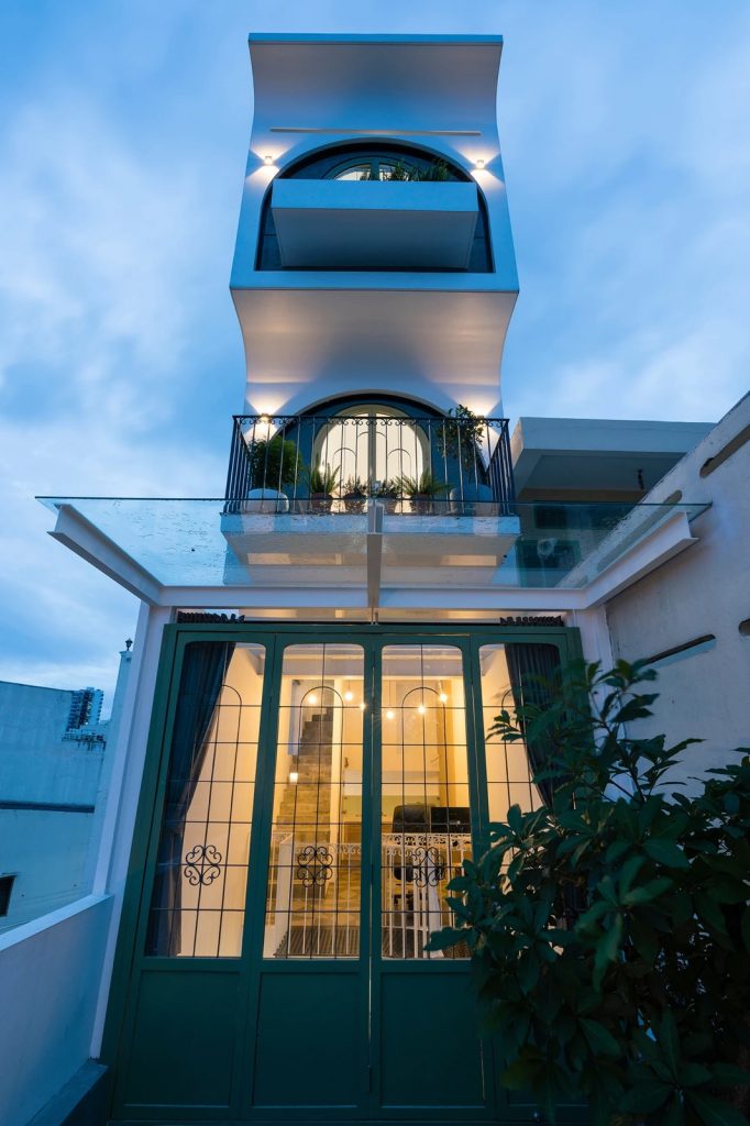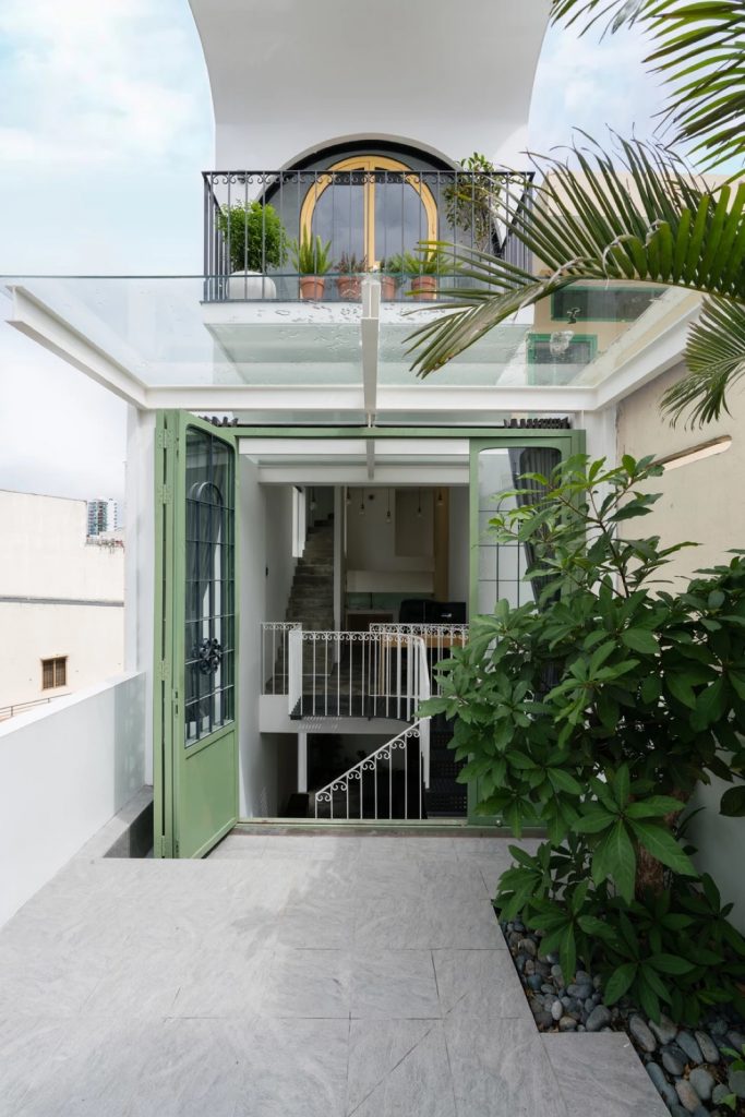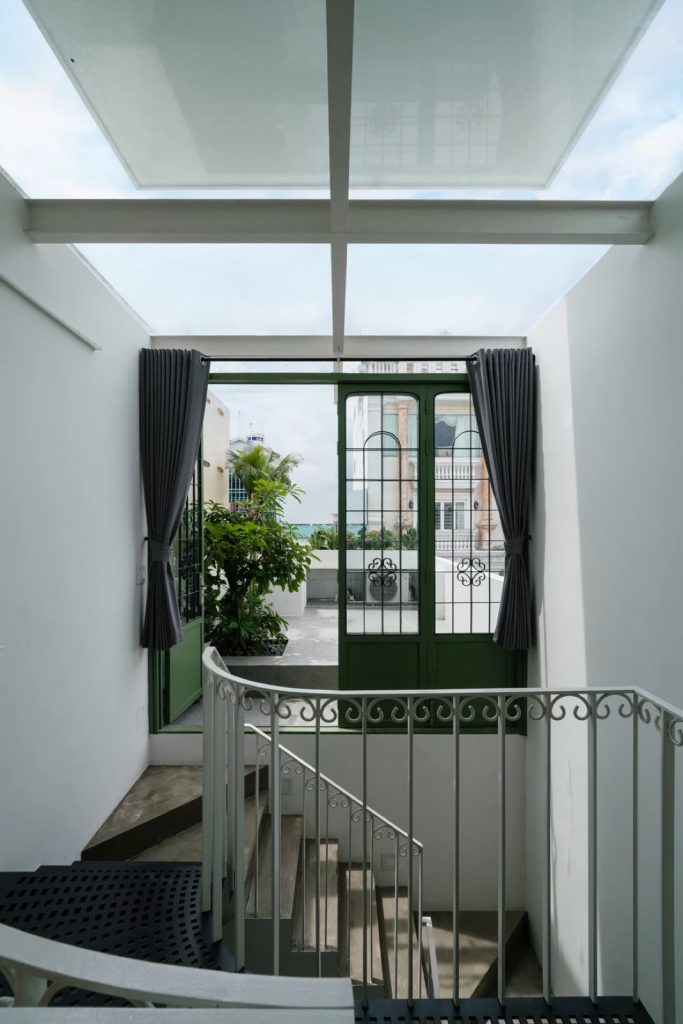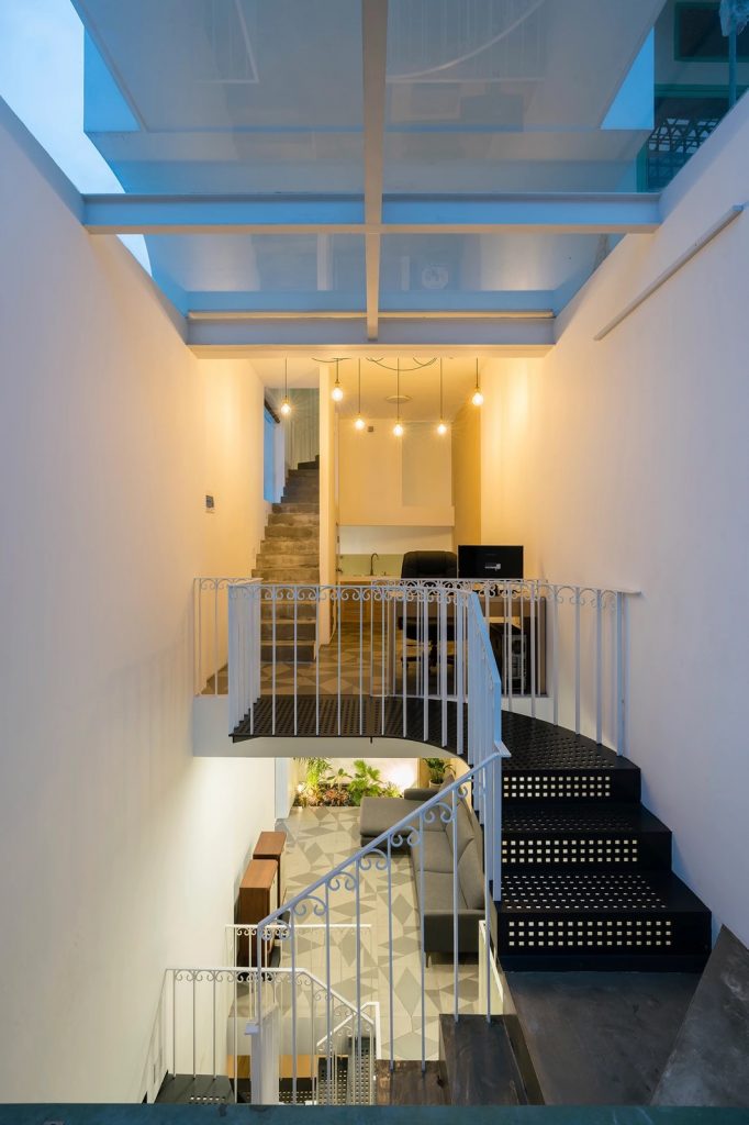 Đầu tiên, giải pháp chia công trình làm hai phần theo chiều cao, đẩy lùi khối kiến trúc phía trên về sau. Khoảng lùi này sẽ thay đổi cao độ mặt đứng phía trước, phần phía sau không thể nhìn thấy từ con đường rộng 4,5m bên dưới giữ tương quan cân đối của căn nhà trong khu phố. Sự lùi lại của khối tích phía trên cũng làm tăng diện tích tiếp xúc tự nhiên cho lõi thông tầng, khai thác tối ưu ánh sáng từ mặt đứng hướng Đông.
