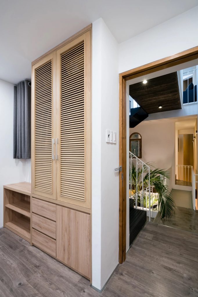 Tiếp theo, hai thông tầng được bố trí ở giữa và cuối công trình. Thông tầng phía sau gần như chỉ là đường thông gió, giúp nắn lại thế đất góc cạnh. Thông tầng chính ở giữa cũng chỉ cho phép chiếm diện tích nhỏ trong tổng thể 36m² sàn. Với các phòng xung quanh – suốt ba tầng nhà – giải pháp bố cục khoảng không thẳng đứng sẽ không đảm bảo cường độ sáng cho các không gian bên dưới. Ý tưởng tịnh tiến (SHIFT) các không gian chức năng hướng về phía Đông sẽ tạo ra một khoảng trống “xiên”, tối đa ánh nắng cho khu vực bếp và phòng ăn vào buổi sáng, thời gian diễn ra nhiều hoạt động nhất trong ngày.