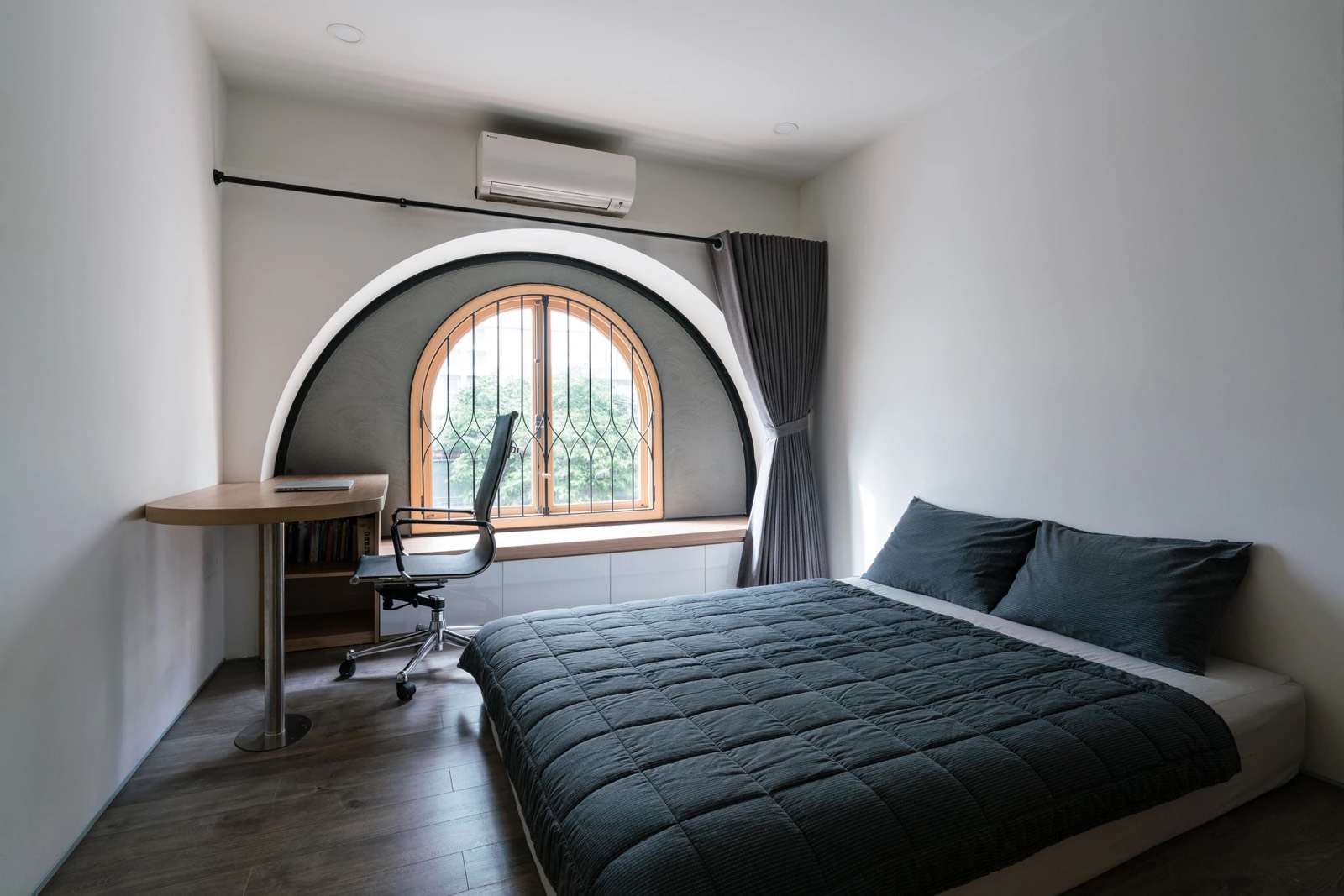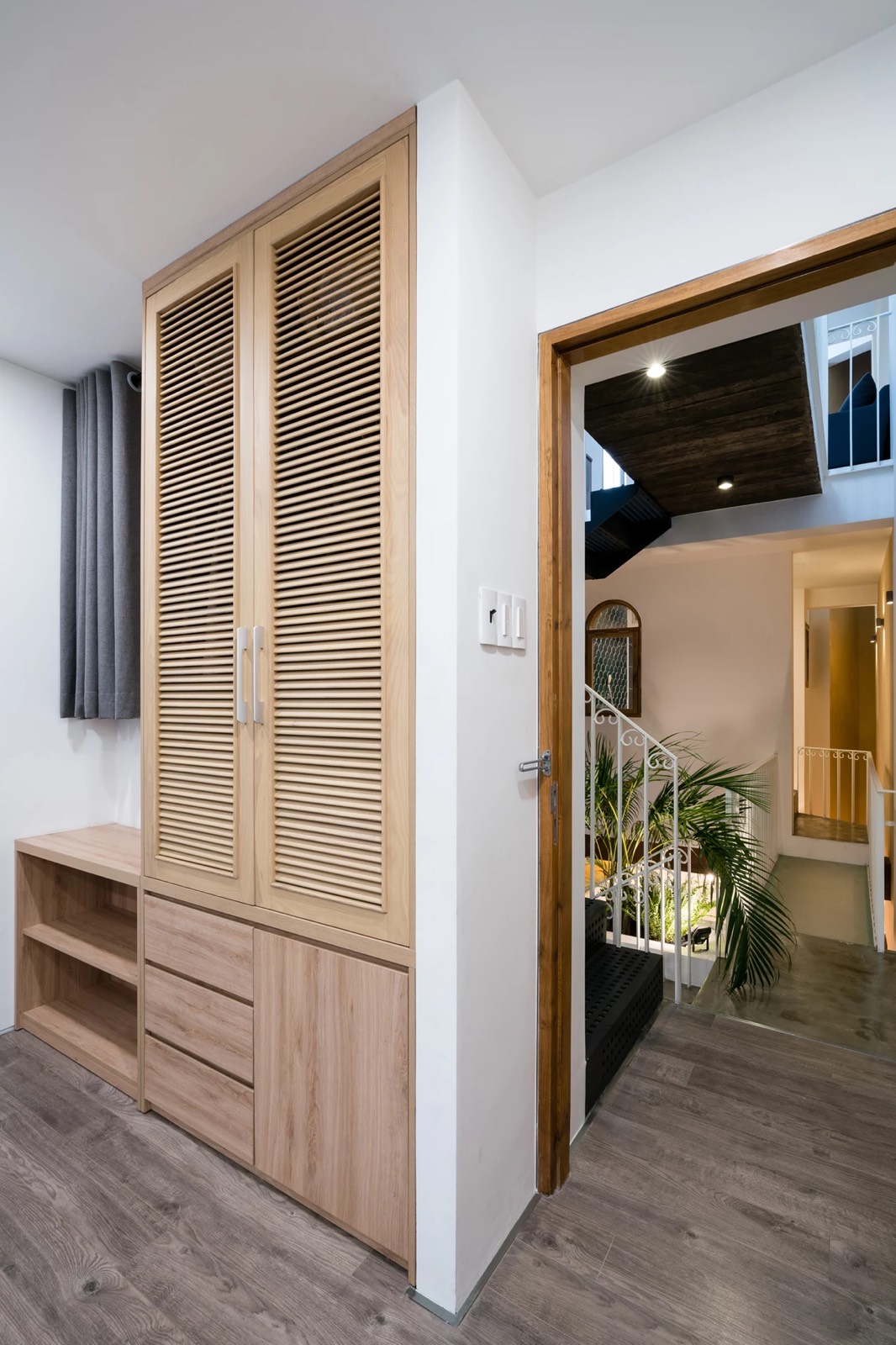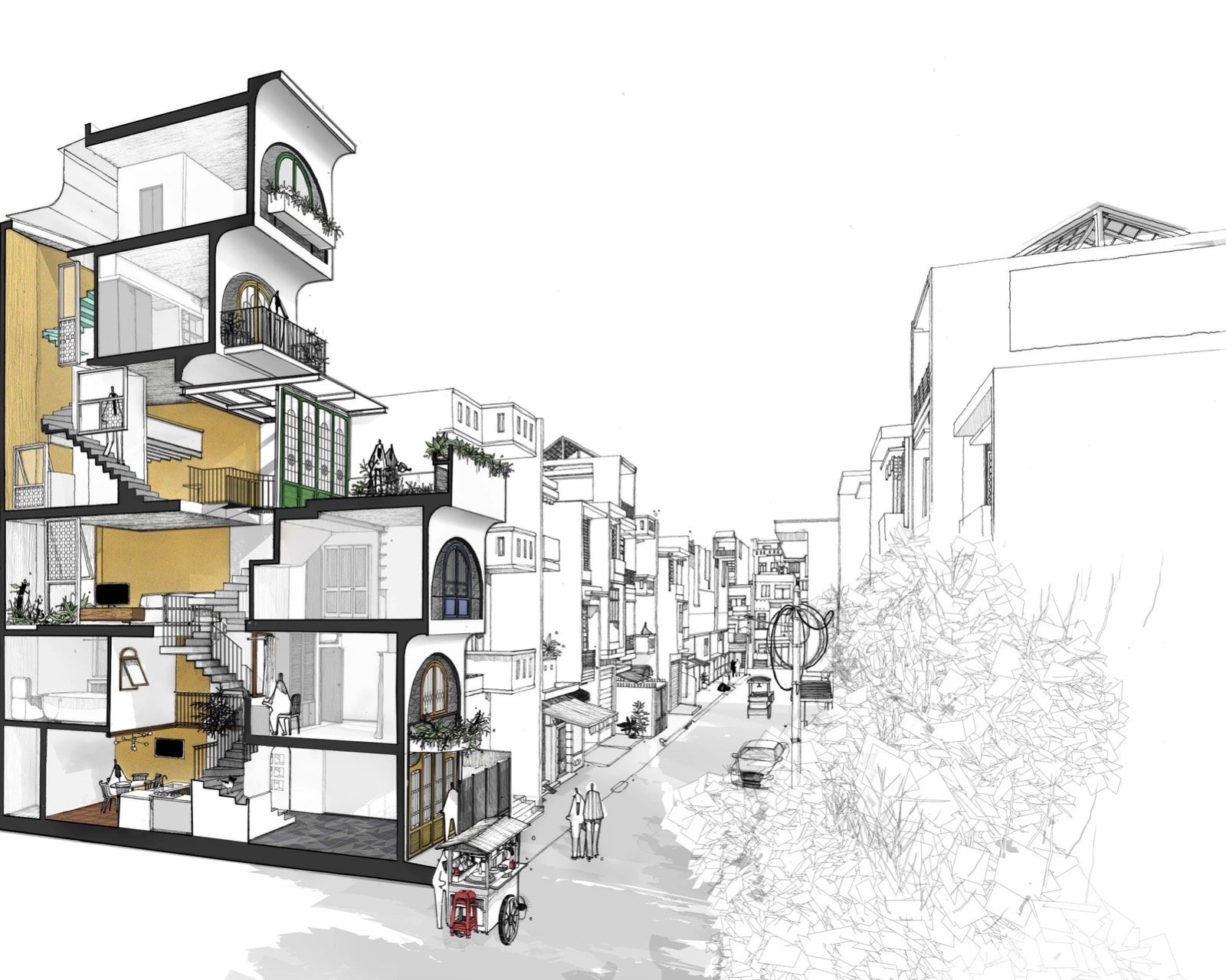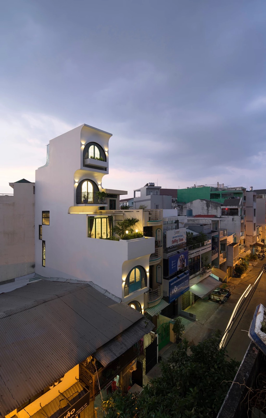 Đầu tiên, giải pháp chia công trình làm hai phần theo chiều cao, đẩy lùi khối kiến trúc phía trên về sau. Khoảng lùi này sẽ thay đổi cao độ mặt đứng phía trước, phần phía sau không thể nhìn thấy từ con đường rộng 4,5m bên dưới giữ tương quan cân đối của căn nhà trong khu phố. Sự lùi lại của khối tích phía trên cũng làm tăng diện tích tiếp xúc tự nhiên cho lõi thông tầng, khai thác tối ưu ánh sáng từ mặt đứng hướng Đông.