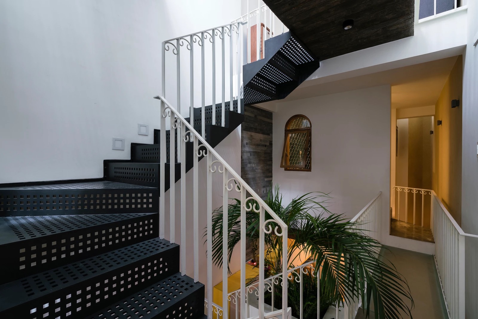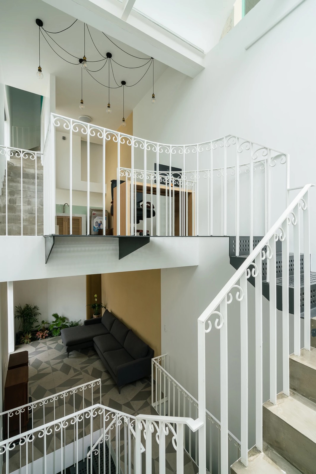 Cầu thang thay đổi linh hoạt theo cao độ và vị trí tương ứng giữa các sàn, nương theo chiều xiên của lõi thông tầng. Thân thang, mặt bậc sử dụng vật liệu có khả năng xuyên sáng một phần, cho phép ánh sáng len lỏi, tạo ra hiệu ứng bóng đổ lên những bề mặt xung quanh.