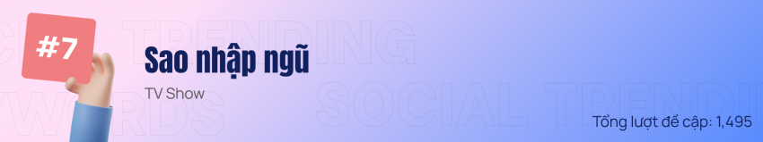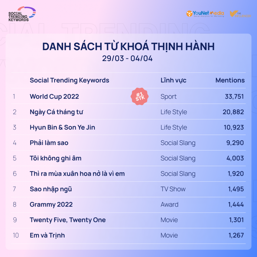 Danh sách từ khóa tuần qua chứng kiến sự áp đảo đến từ những sự kiện giải trí nổi bật, cùng với đó là màn xuất hiện của loạt Social Slang mới hứa hẹn sẽ tiếp tục “gây bão” trong thời gian tới.