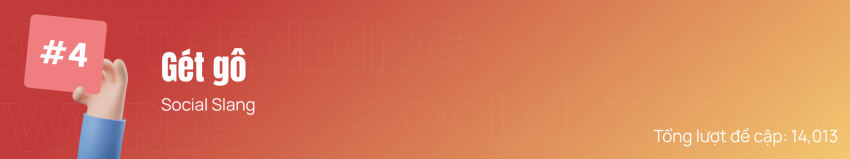 Gét gô là cụm từ phát âm sai, nói chệch đi từ “let’s go” (đi thôi/ làm thôi). Người khởi xướng cho trào lưu này là một tiktoker có tên Tới trời thần (@anhtoi4). Đây đã là tuần thứ ba liên tiếp, Gét gô lọt vào BXH từ khóa hot nhất tuần. Với sự hài hước vừa đủ không quá lố, lại dễ ứng dụng bắt trend trong nhiều hoàn cảnh, cho nên từ ngôi sao cho đến công chúng, fanpage đủ các chủ đề, ai ai cũng đều đu trend Gét gô giúp social slang này phủ sóng khắp mạng xã hội.