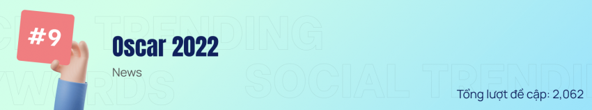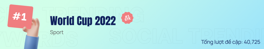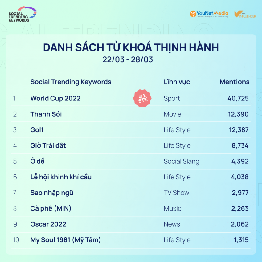Với nhiều thay đổi bất ngờ so với tuần trước, vị trí đầu bảng trong danh sách từ khóa thịnh hành tuần này thuộc về World Cup 2022, dưới sự ảnh hưởng của trận đấu Việt Nam gặp Oman vào tối ngày 24/3. Tuy nhận về kết quả thua 0 – 1, đội tuyển Việt Nam vẫn nhận được những lời cổ vũ và động viên đến từ người dân cả nước do nhiều cái tên trụ cột đã không thể tham gia do chấn thương và nhiễm COVID-19. Qua mùa giải năm nay, cổ động viên Việt Nam có quyền hy vọng về những chiến thắng xa hơn của các chiến binh áo đỏ với những triển vọng và tiềm năng mà các cầu thủ đã thể hiện trên sân cỏ. Đây cũng là cơ hội sáng giá dành cho các thương hiệu khi việc hợp tác với cầu thủ bóng đá đang trở thành xu hướng được khán giả quan tâm.