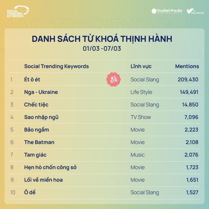 Cùng điểm qua những từ khóa hot nhất mạng xã hội trong tuần qua (1/3 – 7/3/2022) do The Influencer phối hợp cùng YouNet Media thống kê và thực hiện xếp hạng: