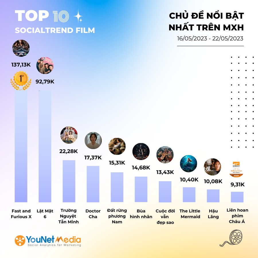 Ở mảng Phim ảnh, Fast and Furious X một lần nữa khẳng định sức hút của series bom tấn Fast and Furious với 138.434 thảo luận. Ngay trong tuần công chiếu đầu tiên, bộ phim đã thống lĩnh doanh thu các phòng vé Bắc Mỹ với doanh thu mở màn ước tính 67,5 triệu USD, trở thành bộ phim có doanh thu mở màn lớn nhất tại thị trường quốc tế kể từ đầu năm đến nay.