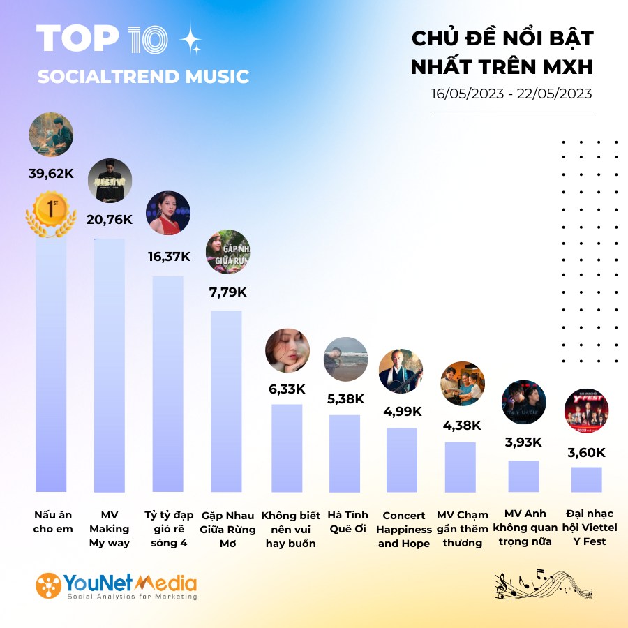 Lĩnh vực âm nhạc tuần này đánh dấu sự trở lại của 2 giọng ca vốn được đông đảo cộng đồng mạng yêu thích là Đen Vâu và Sơn Tùng M-TP với sản phẩm âm nhạc lần lượt là Bài hát Nấu ăn cho em và MV Making My Way. Mặc dù đã ra mắt từ ngày 13/5, nhưng bài hát Nấu ăn cho em – đánh dấu sự trở lại của Đen Vâu vẫn giữ vững vị trí Top 1 với 39.630 lượt thảo luận. Cùng với đó, MV Making My Way – đánh dấu sự trở lại mạnh mẽ của Sơn Tùng M-TP đã có dấu hiệu hạ nhiệt sau khi đạt những thành tích đáng nể như 10M views sau 3 ngày công chiếu, đạt Top 1 YouTube Trending chỉ sau 7 tiếng ra mắt.