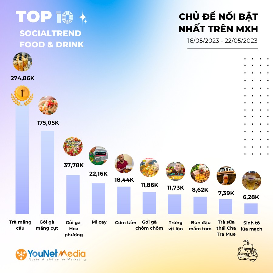 “Gỏi gà măng cụt” chưa kịp hạ nhiệt thì “Gỏi gà hoa phượng”, “Gỏi gà chôm chôm” đã góp mặt trong bảng xếp hạng bởi tính độc lạ và hương vị hoà quyện bất ngờ mà các món ăn mang lại. Trong đó, “gỏi gà măng cụt” là chủ đề đang có xu hướng tăng trưởng và có đến 81,20K thảo luận trên các kênh Facebook Page và 69,68K thảo luận trên nền tảng TikTok.