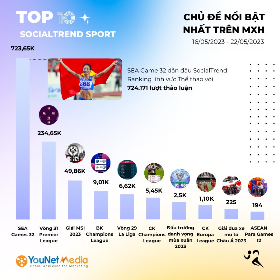Không nằm ngoài dự đoán, SEA Game 32 chiếm lĩnh Top 1 SocialTrend Ranking Sport với lượng thảo luận khủng, vượt xa những chủ đề còn lại. Một trong những chủ đề liên quan được cộng đồng mạng bàn tán nhiều nhất Đoàn Thể thao Việt Nam chính thức dẫn đầu bảng tổng sắp huy chương, gồm 136 huy chương Vàng, 105 huy chương Bạc và 114 huy chương Đồng, vượt chỉ tiêu đề ra là 90 – 120 Huy chương Vàng. Theo ghi nhận từ nền tảng SocialTrend, có đến gần 20 nhãn hàng năng động như RedBull, Honda, Agribank, Vietravel,… đã có bài đăng bắt nhịp cùng SEA Game 32.