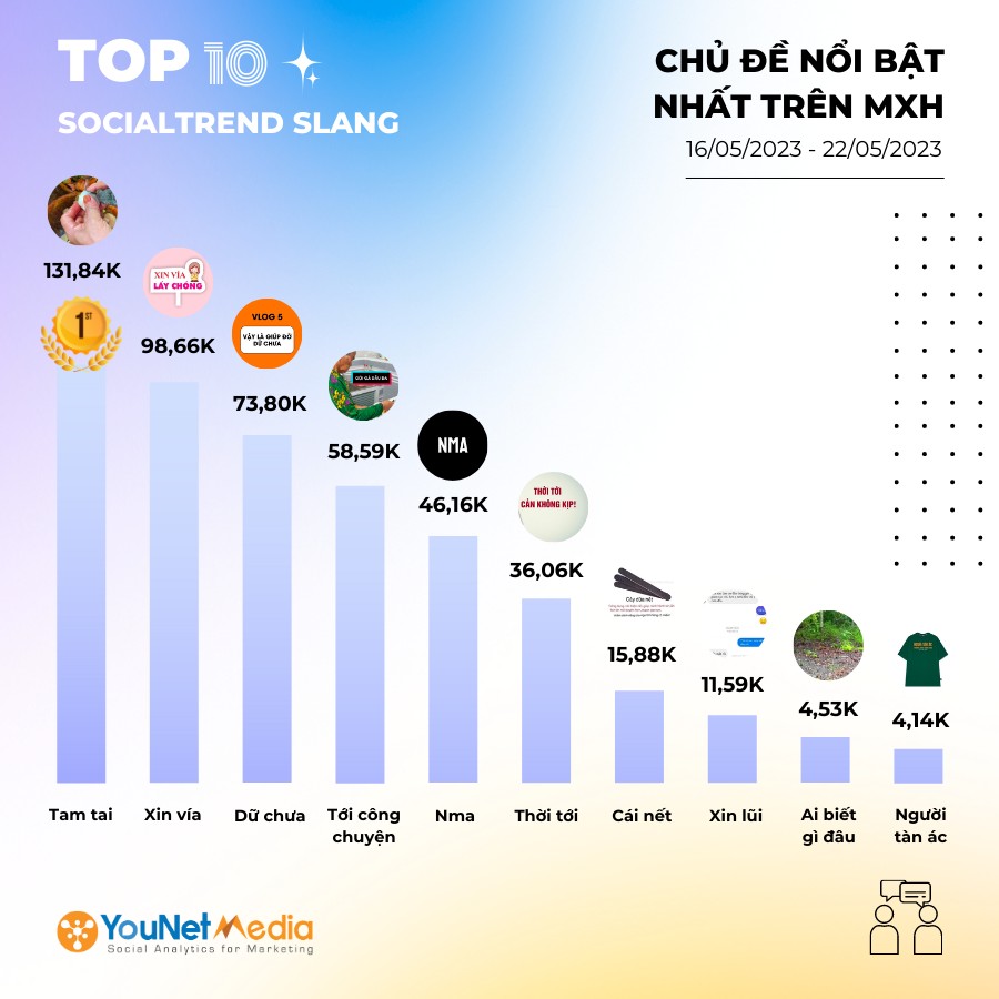 BXH Top 10 Social Trend Ranking Tuần 16/5 – 22/5/2023 là BXH đầu tiên trong chuỗi bài viết. Đây là tuần lễ đánh dấu nhiều sự kiện đặc biệt như các trận đấu của Đoàn Thể thao Việt Nam tại SEA Game 32, series bom tấn Fast and Furious công chiếu phần thứ 10, Bảo Anh chính thức phát hành teaser MV Cô Ấy Của Anh Ấy,.. Bên cạnh đó, social slangs tam tai và những món gỏi gà, trà trái cây cũng là chủ đề gây bão cộng đồng mạng suốt tuần qua.