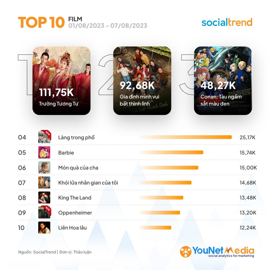 Nhìn chung, cả hai BXH SocialTrend Ranking Film và Music tuần này đều có lượng thảo luận tăng khá cao so với BXH tuần trước, dẫn đến sự thăng hạng vượt bậc của một số chủ đề như bộ phim Trường Tương Tư, bộ phim Gia đình mình vui bất thình lình, bài hát À Lôi,… Ngoài ra, hai lĩnh vực này cũng đón nhận nhiều chủ đề mới xuất hiện nhưng đã tạo ra sức hút thảo luận khá tốt trên mạng xã hội như bộ phim Làng trong phố, bộ phim Oppenheimer, MV Cake, MV Ngõ chạm, Đại nhạc hội Happy Bee 13, Lễ hội âm nhạc FWD Music Fest 2023 và Album ISTJ của NCT Dream.