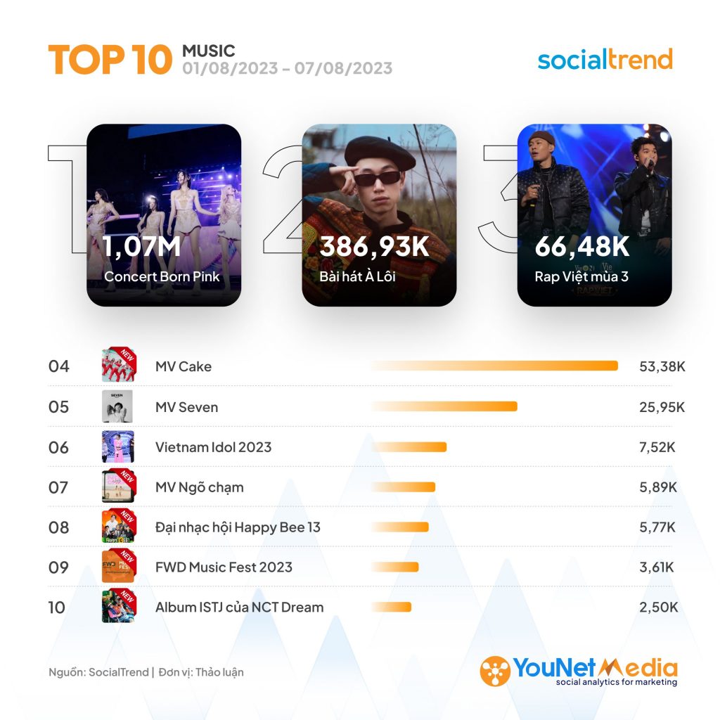 Âm nhạc là lĩnh vực sôi động nhất trên MXH tuần này khi đón nhận hàng loạt chủ đề mới như MV Cake của nhóm nhạc nữ Hàn Quốc ITZY – xếp #4 với 53,38K thảo luận và 580,25K lượt tương tác, MV Ngõ chạm của BigDaddy và Emily- xếp #7 với 5,89K thảo luận và 362,86K lượt tương tác, Đại nhạc hội Happy Bee 13 do trường Cao đẳng FPT Polytechnic tổ chức – xếp #8 với 5,77K thảo luận và 15,50K lượt tương tác, Lễ hội âm nhạc FWD Music Fest 2023 do Công ty Bảo hiểm FWD tổ chức- xếp #9 với 3,61K thảo luận và 23,98K lượt tương tác, Album ISTJ của nhóm nhạc NCT Dream – xếp #10 với 2,50K thảo luận và 6,99K lượt tương tác.