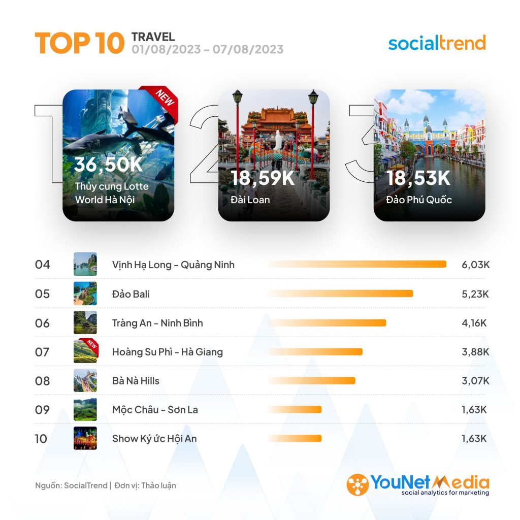 Điều thú vị của BXH SocialTrend Ranking tuần này là sự quay trở lại của BXH SocialTrend Ranking – Lĩnh vực Du lịch sau 05 tuần vắng bóng với màn xuất hiện của loạt địa điểm du lịch hot hit trong những tuần cuối cùng của mùa hè 2023.