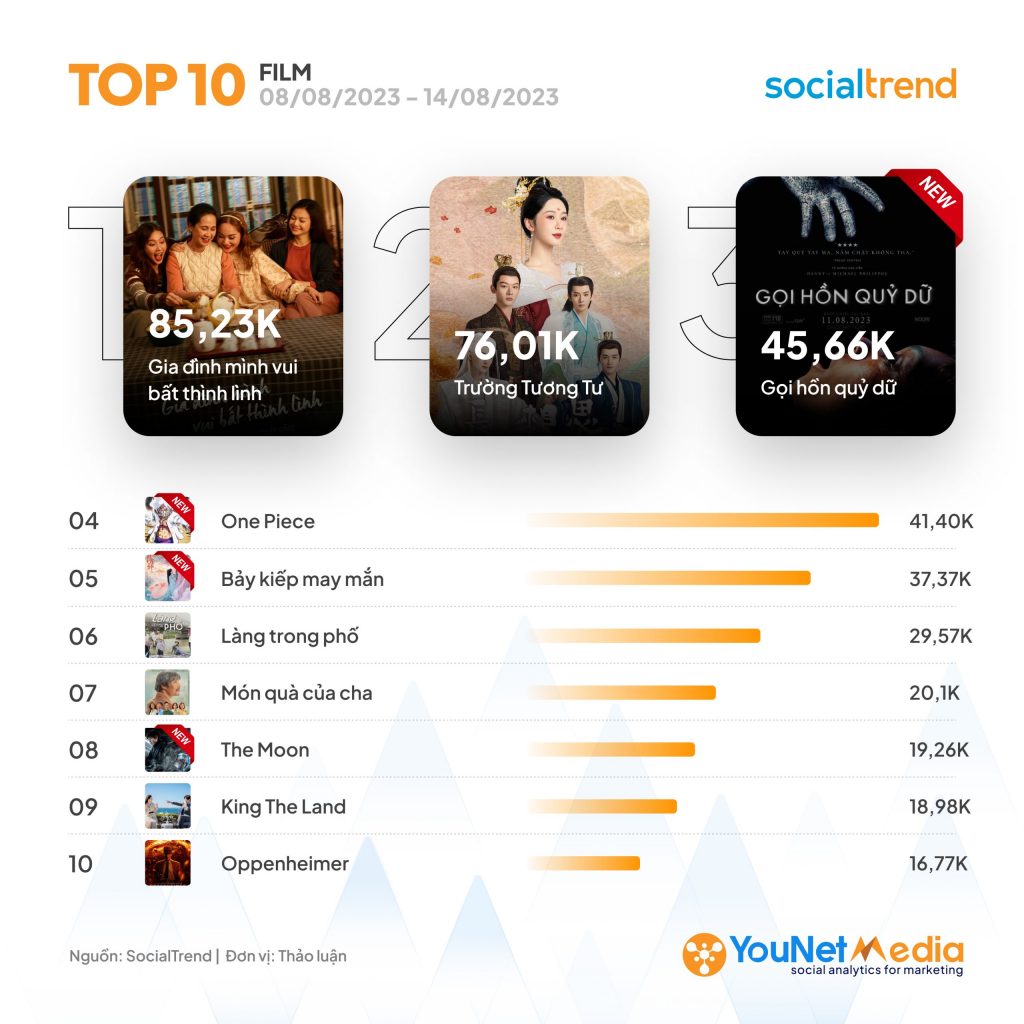 Phim ảnh và Âm nhạc vẫn là hai lĩnh vực sôi động trong tuần này với nhiều chủ đề nóng đang được thảo luận sôi nổi. Theo đó, sự xuất hiện của các bộ phim chiếu rạp như Gọi hồn quỷ dữ, The Moon, tin về phim One Piece hay MV Xóa tên anh đi, Concert Hẹn ước 10 năm, Chương trình Ca sĩ Mặt nạ – The Masked Singer Vietnam Mùa 2,… càng làm mạng xã hội tuần qua liên tục tăng “nhiệt”.