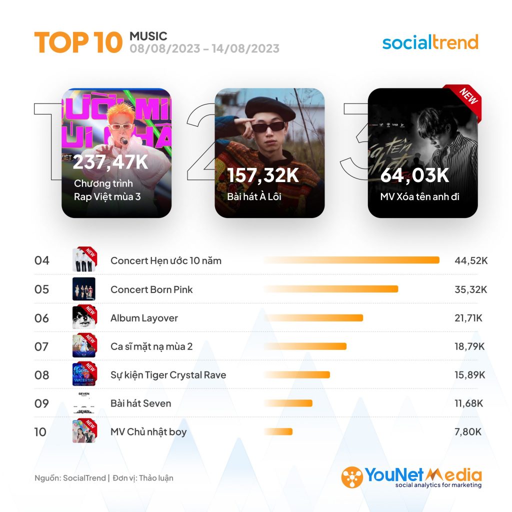 Trong tuần này, lĩnh vực Âm nhạc tiếp tục đón nhận loạt chủ đề mới đang tạo những “cơn sóng sau xô sóng trước” trên mạng xã hội như: MV Xóa tên anh đi – sản phẩm âm nhạc đánh dấu sự trở lại của Jack trên đường đua âm nhạc Việt với 64,03K thảo luận, Concert Hẹn ước 10 năm – kỷ niệm 10 năm hoạt động và lần hiếm hoi đứng chung sân khấu của nhóm TFBOYS với 44,52K thảo luận, Album Layover – album solo đầu tay của nam Idol Hàn Quốc V (BTS) với 21,71K thảo luận, Chương trình Ca sĩ Mặt nạ – The Masked Singer Vietnam mùa 2 với 18,79K thảo luận, Sự kiện Tiger Crystal Rave – chuỗi sự kiện Water EDM Festival sẽ diễn ra tại TP.HCM vào ngày 26/08 sắp tới với 15,89K thảo luận và MV Chủ nhật Boy – ra mắt vào ngày 06/08 vừa qua, đánh dấu sự kết hợp giữa Hứa Kim Tuyền và AMEE với 7,8K thảo luận.