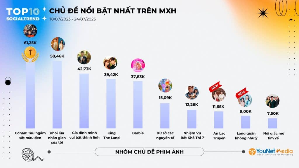 Trên đây là Top 10 những chủ đề thu hút thảo luận sôi nổi nhất trên MXH lĩnh vực Phim ảnh, Âm nhạc, Ăn uống Tuần 18/07 – 24/07/2023. Để theo dõi những chủ đề trending nhất hàng tuần, hãy theo dõi các bài viết tiếp theo trên YouNet Media.