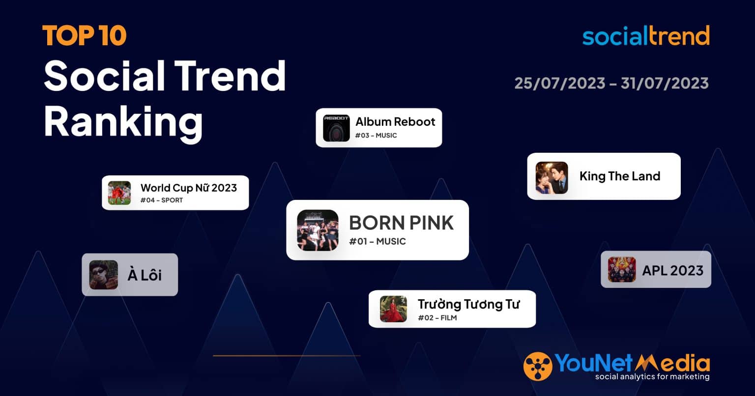 Sau 02 ngày diễn ra, sức nóng từ Concert BORN PINK đã “đốt cháy” hàng ngàn thảo luận và hàng triệu tương tác từ người dùng mạng xã hội. Trong khi đó, mạng xã hội cũng xuất hiện một số chủ đề mới nhưng đã tạo ra “cơn sốt”như: Bộ phim Trường Tương Tư, Món quà của cha, Album Reboot, Bài hát À Lôi, Giải đấu Free Fire World Series 2023,… Cùng YouNet Media khám phá những chủ đề đang làm xôn xao cộng đồng mạng thông qua Bảng xếp hạng SocialTrend Ranking tuần 25/07 – 31/07/2023.