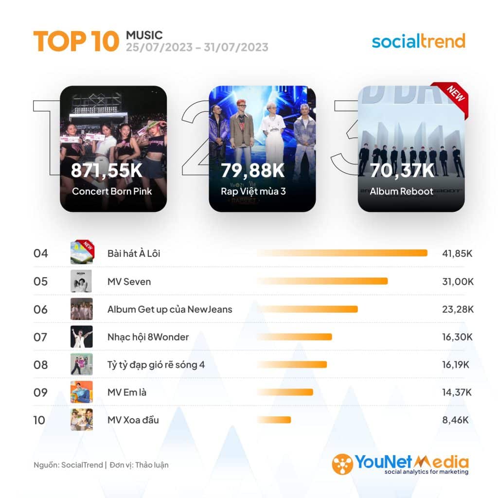 Kể từ khi có thông báo tổ chức, Concert BORN PINK đã không ngừng khuấy đảo các trang mạng xã hội và xuất hiện trên BXH SocialTrend Ranking Music trong 5 tuần liên tiếp. Chính thức diễn ra vào ngày 29&30/7 vừa qua, Concert BORN PINK đã thực sự bùng nổ trên mạng xã hội với hơn 871,55K lượt thảo luận và hơn 10M lượt tương tác, tăng hơn 700K thảo luận so với BXH tuần 18/07 – 24/07.