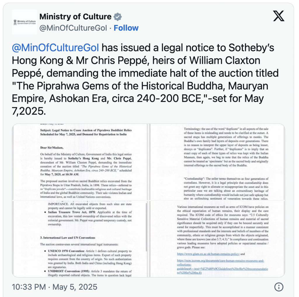 Bộ sưu tập được gọi là “Đá quý Piprahwa” được khai quật vào năm 1898 từ một bảo tháp ở miền Bắc Ấn Độ, và kể từ đó vẫn nằm trong tay một gia đình người Anh. Buổi đấu giá ban đầu dự kiến diễn ra vào ngày 7 tháng 5, nhưng đã bị hoãn đột ngột sau khi chính phủ Ấn Độ can thiệp, khẳng định rằng các hiện vật này là thiêng liêng và thuộc về di sản không thể thay thế của quốc gia.