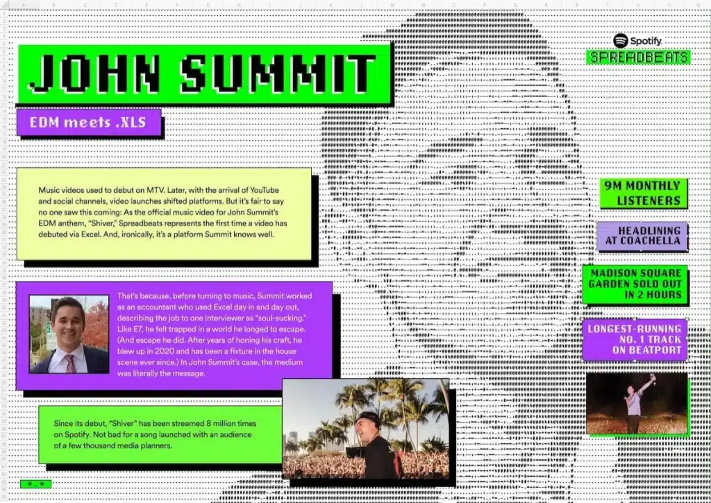 Trên nền ca khúc Shiver của nhà sản xuất âm nhạc John Summit – người từng là kế toán và gần như “ăn ngủ” với Excel mỗi ngày, MV “Spreadbeats” của Spotify đã cho thấy âm nhạc mang đến trải nghiệm tuyệt vời như thế nào.
